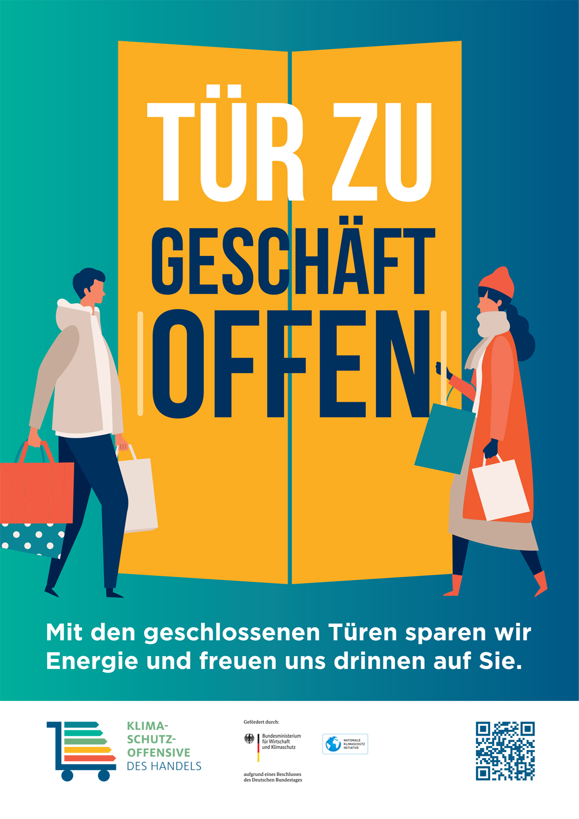 Da aber gleichzeitig bekannt ist, dass bei geschlossenen Ladentüren weniger Kunden ins Geschäft kommen und durch weniger Beleuchtung auch der Werbeeffekt auf der Straße nachlässt, haben der Handelsverband NRW und die Klimaschutzoffensive unter anderem Plakate entwickelt, um die Kunden auf die Thematik hinzuweisen und zu zeigen: Türen zu, Geschäft offen!