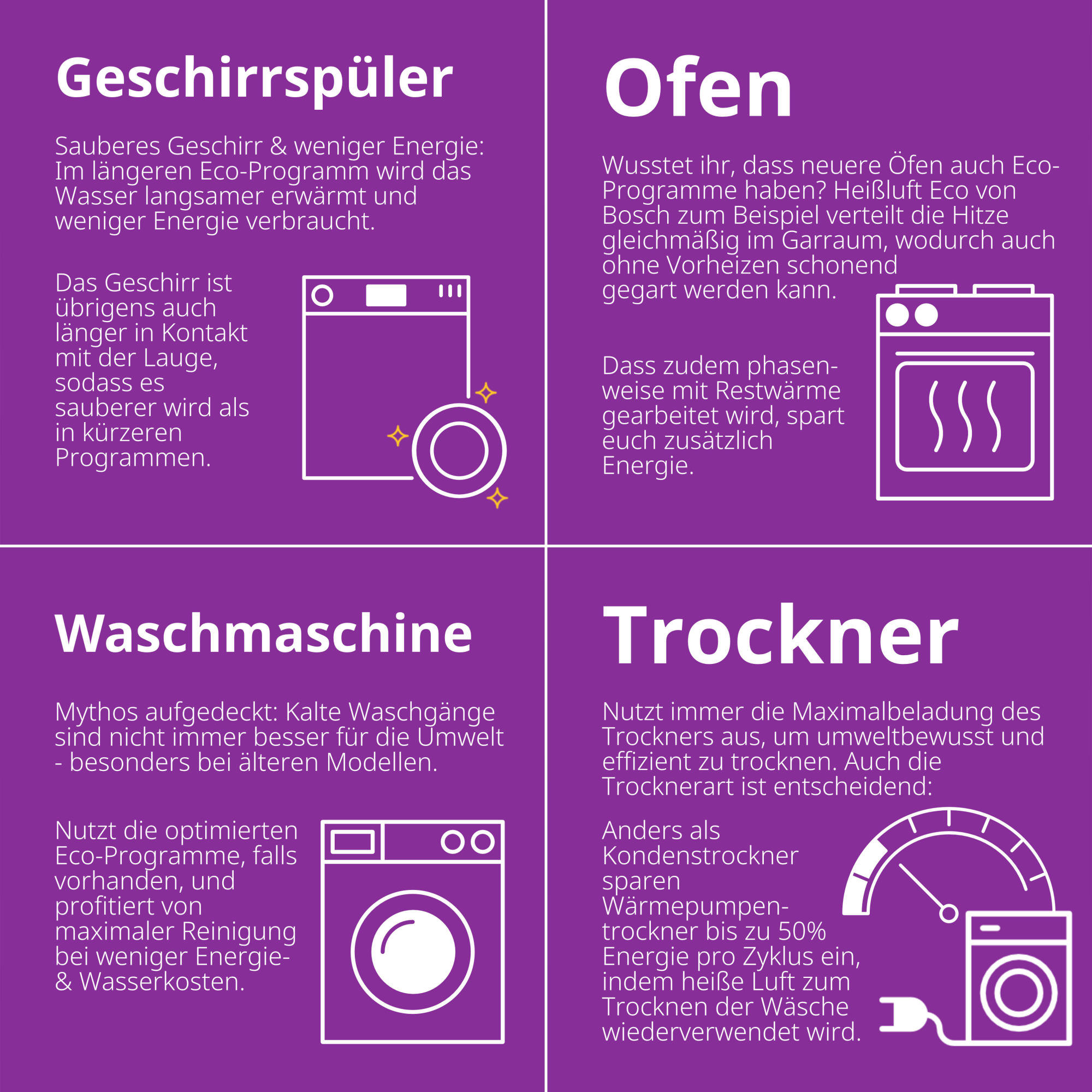 Eine Überdosierung kostet zusätzliche Energie, da das überschüssige Waschmittel durch weitere Waschzyklen herausgewaschen werden muss. Durch die i-DOS Dosierautomatik neuer Waschmaschinen lassen sich bis zu 10 Liter Wasser und 38% Waschmittel pro Waschzyklus einsparen. Die fortschrittliche Sensorik und ein hocheffizientes Wassermanagement der neuen Premium-Waschmaschinen helfen zudem, weitere 20% Strom im Vergleich zur besten Energieeffizienzklasse A einzusparen. Die Nutzung des Eco-Programms trägt zusätzlich deutlich zur Reduzierung von Stromkosten und Umweltbelastung bei – auch über die Waschmaschine hinaus: Geschirrspüler sowie einige neue Kühl- /Gefrierkombinationen und Backöfen verfügen ebenfalls über ein Eco-Programm.