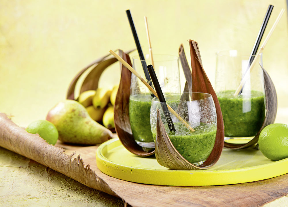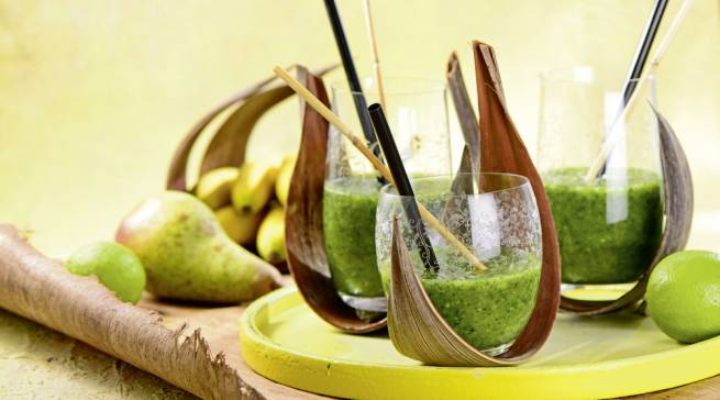 Zuerst Früchte, dann Blattspinat oder Feldsalat und Ingwer in eine Küchenmaschine geben. Limettensaft, Wasser und Matcha dazu, pürieren, bis alles eine sämige Konsistenz hat, und frisch genießen.