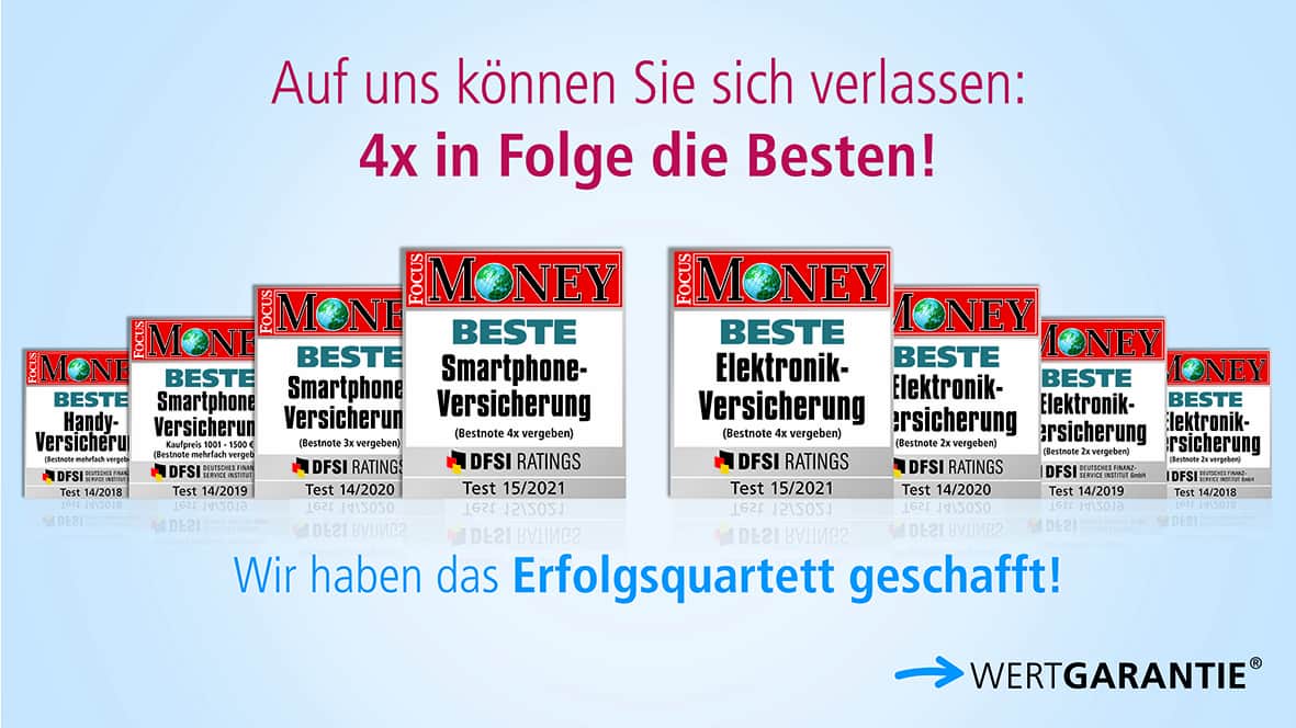 Ende März wurde Wertgarantie dann zum vierten Mal in Folge als „Beste Elektronikversicherung“ und „Beste Smartphoneversicherung“ ausgezeichnet: Der Schwerpunkt der Studie von Focus Money lag auf Handys, Tablets, Smartwatches und Laptops. Gewertet wurden alle relevanten Angaben zu Preis, Leistungsumfang, Art und Weise des Vertragsabschlusses, Ablauf der Schadensmeldung, Erstattung und Leistungsabwicklung verschiedener Produkte unterschiedlicher Anbieter.