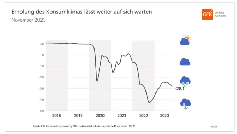 Der prognostizierte Wert des Konsumklimas im November sinkt somit auf -28,1 Punkte und beträgt 1,4 Punkte weniger als im Vormonat (revidiert -26,7 Punkte). Dies sind Ergebnisse des GfK Konsumklimas powered by NIM für Oktober 2023. Seit Oktober 2023 wird es gemeinsam von GfK und dem Nürnberg Institut für Marktentscheidungen (NIM), Gründer der GfK, herausgegeben.