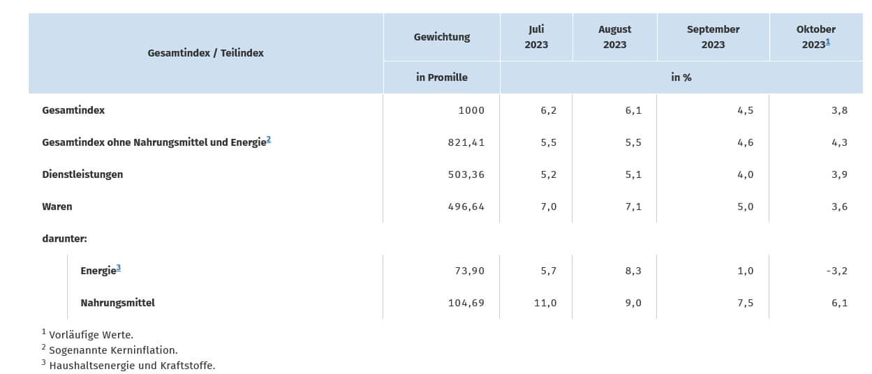 Für eine Trendwende beim Konsum ist es unverzichtbar, dass sich der derzeit abzeichnende Rückgang des Preisauftriebs fortsetzt. So ist nach Angaben des Statistischen Bundesamtes die Inflationsrate von 6,1% im August auf 4,5% im September und überraschenderweise 3,8% im Oktober gesunken. Dennoch ist der Wert noch ein gutes Stück von der Zielgröße der Europäischen Zentralbank von etwa 2% entfernt.