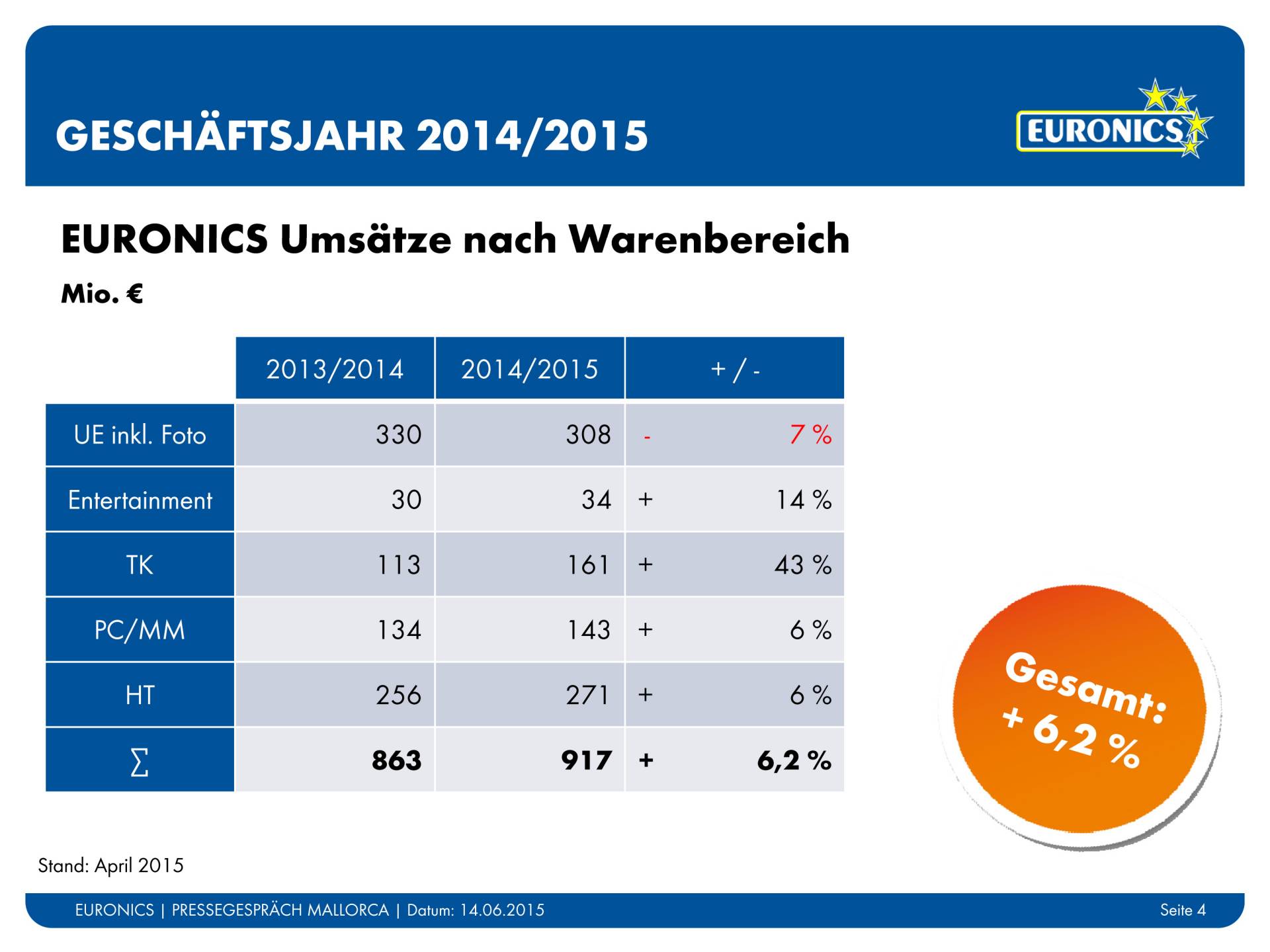 Wirklich gut hat sich der Umsatz der Verbundgruppe in den ersten sieben Monaten des aktuellen Geschäftsjahres mit einem Plus von 6,2 Prozent entwickelt. Die Steigerungsrate hätte locker höher ausfallen können, gäbe es nicht das schwächelnde TV-Geschäft. In diesem Marktsegment fiel der Umsatz leider um 7 Prozent.