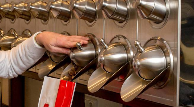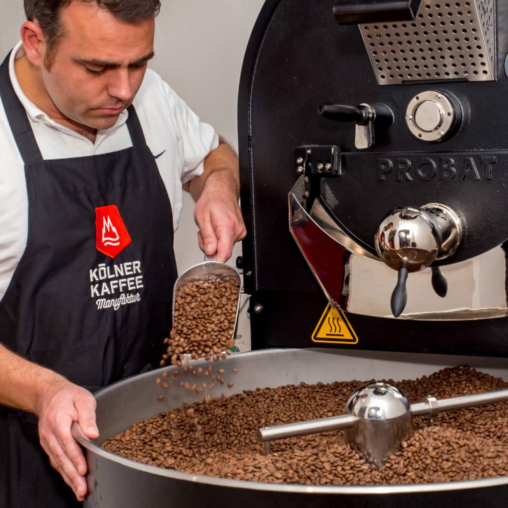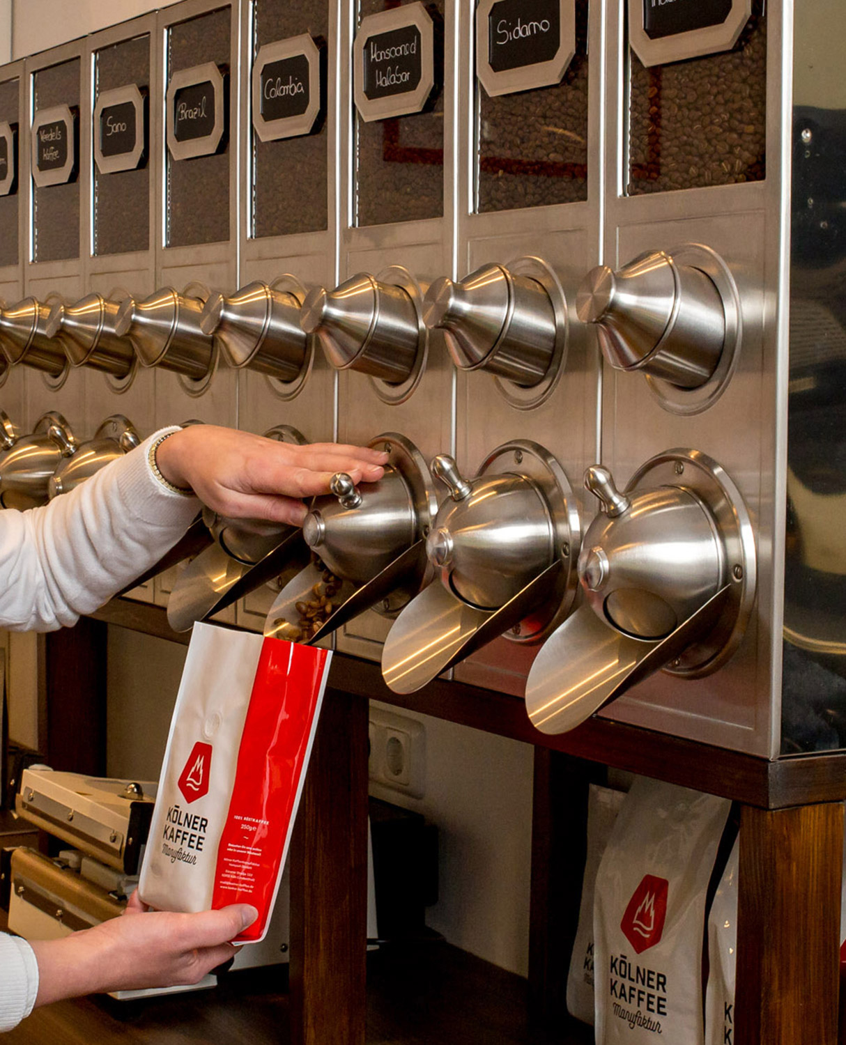 Damit das funktioniert, kommt ein weiterer Genuss-Experte ins Spiel. Georg Hempsch hat vor einigen Jahren zusammen mit seiner Frau Meike im Kölner Westen die „Kölner Kaffeemanufaktur“ gegründet. Die hat sich schnell auch über die Stadtgrenzen hinaus einen Namen gemacht. Neun verschiedene Röstungen von Hempsch (mit dem weißen Logo des Kölner Doms auf rotem Grund) führt „esperto“ im Sortiment. Und die sind fast wie „geschnitten Brot“ gefragt. „Der Kölner ist selbstverliebt. Alle Produkte, die den Kölner Dom zeigen, sind gut“, schmunzelt Caspari.