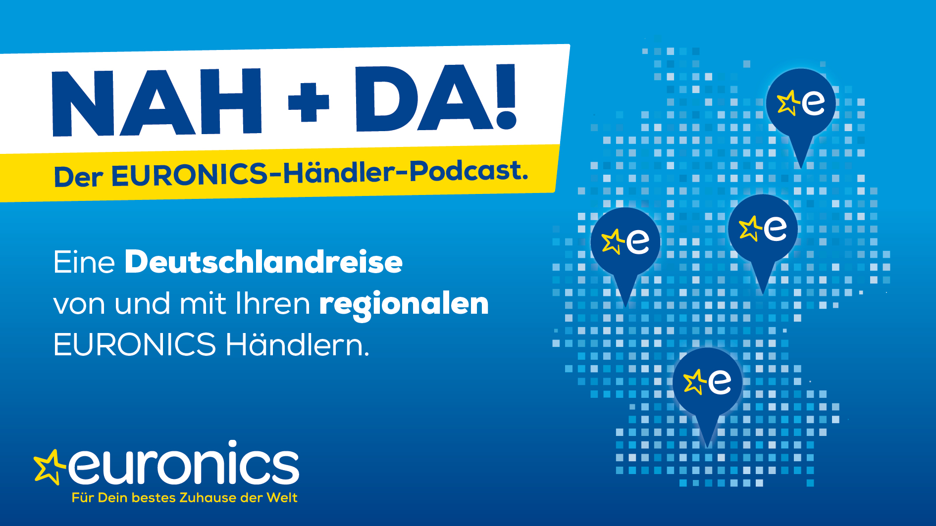 Der Euronics Podcast „Nah + Da!“ ist ab sofort auf vielen Streaming-Portalen verfügbar. In jeder Folge ist ein Händler zu Gast, mal vom Land, mal aus der Großstadt. Im Gespräch stellen die Euronics Mitglieder ihre Fachgeschäfte, Praxisbeispiele, spezielle Services sowie Besonderheiten ihrer Region vor. Das Talk-Format zeigt die Vielfalt der mehr als 1.300 selbstständigen Händler, die zur Verbundgruppe gehören.