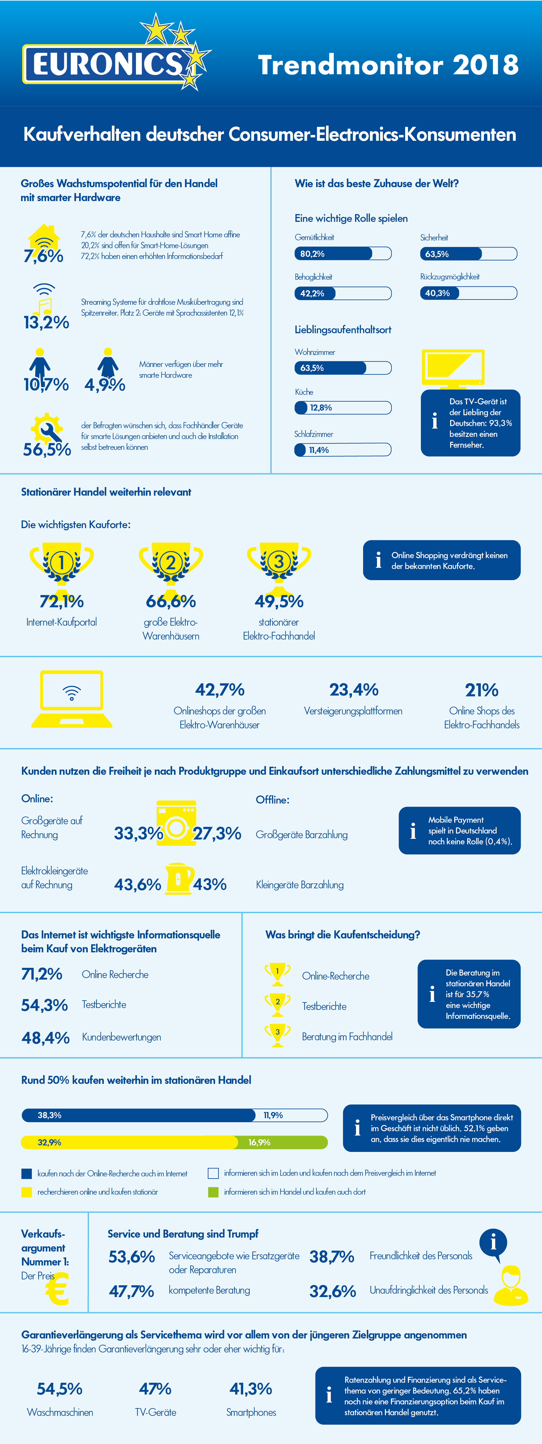 Der stationäre Handel spielt weiterhin ebenfalls eine wichtige Rolle: 66,6 % der Befragten gaben an, Produkte in größeren Elektrofachgeschäften zu kaufen, 49,5 % nutzen Fachgeschäfte. Damit ist Euronics mit seinen großen Warenhäusern à la Euronics XXL, den Fachgeschäften und dem eigenen Online-Shop unter den meist genutzten Kauforten vertreten.