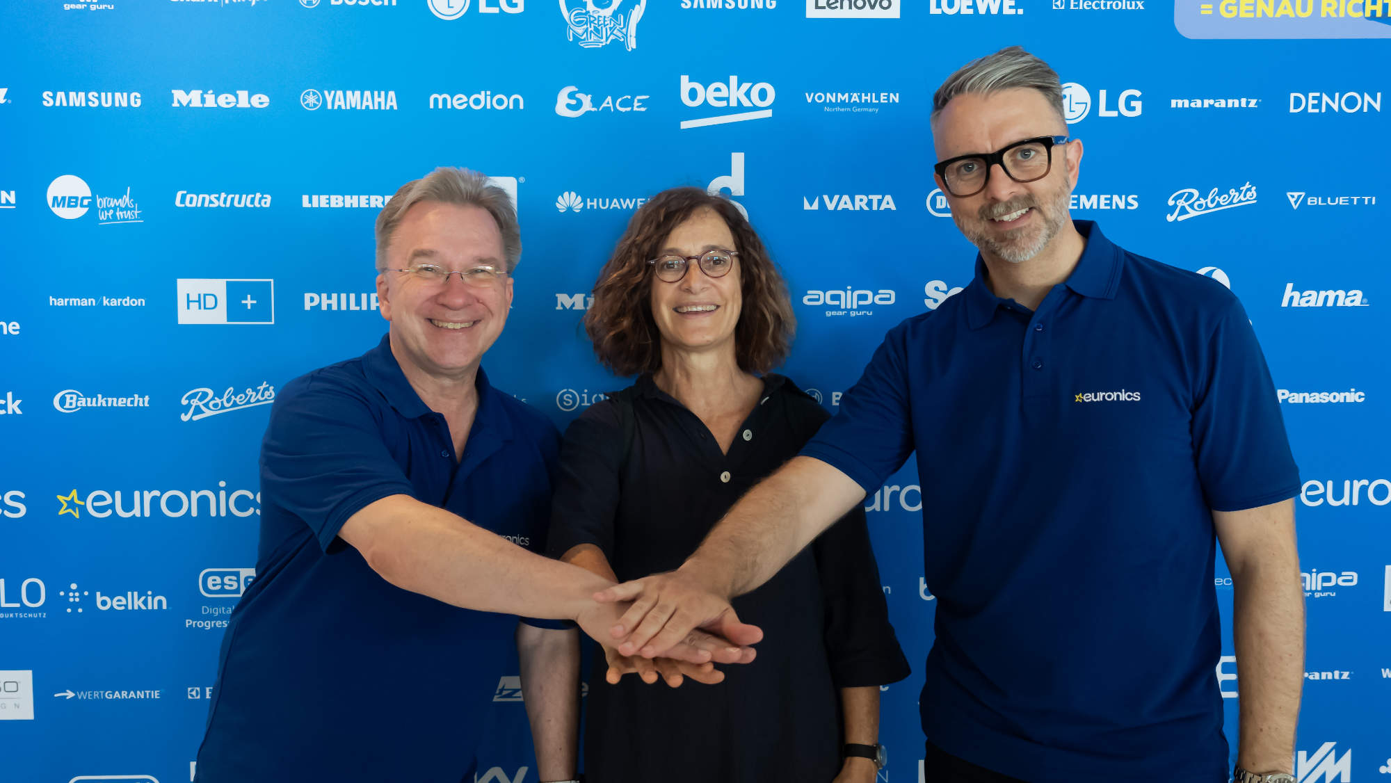 Die Euronics Deutschland eG spendet zusammen mit Industriepartnern Ausstellungsgeräte v. l. n. r.: Benedict Kober, Sprecher des Vorstands Euronics Deutschland eG; Perla Riera, Esment; Brendan Lenane, Vorstand Euronics Deutschland eG
