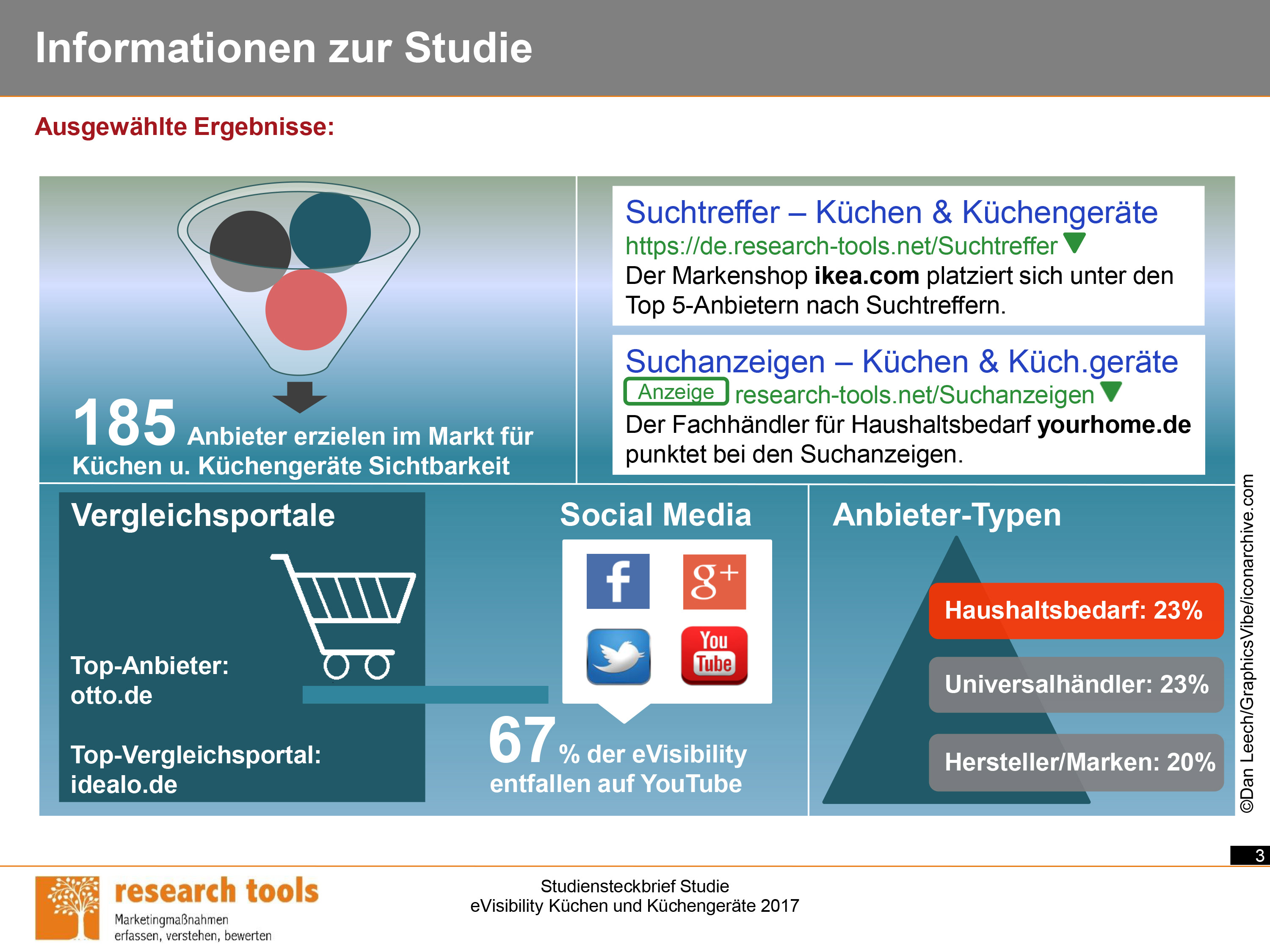 Die Studie „eVisibility Küchen und Küchengeräte 2017“ von research tools untersucht auf 70 Seiten die Präsenz der Top 100 Onlineshops für Küchen und Küchengeräte in den vier Onlinekategorien Suchtreffer, Suchanzeigen, Vergleichsportale und Social Media. Damit zeigt die Studie die Sichtbarkeit der Anbieter im Internet auf und gibt einen umfassenden Wettbewerbsüberblick. Ein Ranking eVisibility listet diese Shops unter Berücksichtigung der Kategorie- und Gesamtpunktzahl. Weitere 85 Shops sind sortiert nach Rängen.