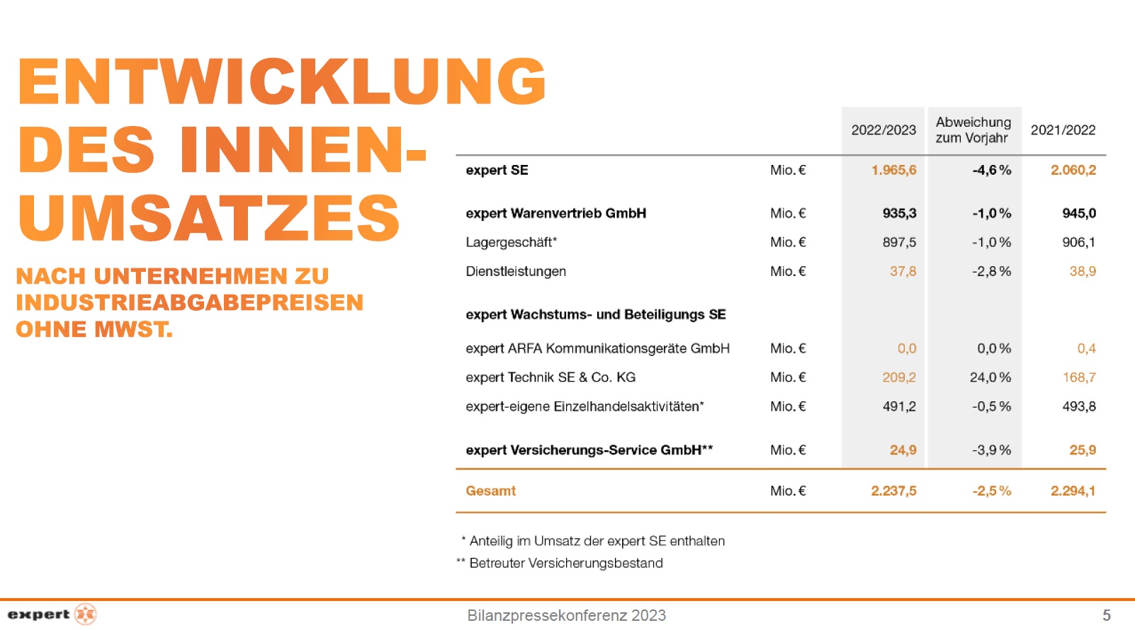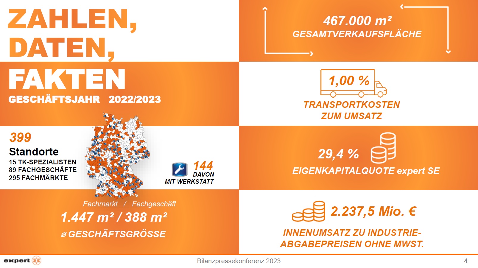 Im expert-Geschäftsjahr 2022/2023 (1. April 2022 bis 31. März 2023) erzielte die expert-Gruppe einen Innenumsatz zu Industrieabgabepreisen ohne Mehrwertsteuer in Höhe von 2,24 Mrd. Euro und lag damit um 2,5% unter dem Vorjahreswert. Trotz des leichten Rückgangs, der auf die angespannte Weltwirtschaftslage zurückzuführen ist, konnte expert nach eigenen Angaben seine starke Position am Markt stabil halten.