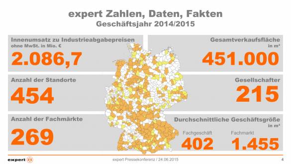 Aktuell sind 215 expert Gesellschafter (Vorjahr 226) an 454 (Vorjahr 461) Standorten aktiv. Im Gegensatz zum Geschäftsjahr 2013 / 2014, in dem es eine starke Flächenexpansion durch Übernahme von 18 ProMärkten sowie weitere 19 Fachmärkte durch bestehende Mitglieder gab, war das aktuell abgeschlossene Geschäftsjahr 2014 / 2015 nur durch ein minimales Flächenwachstum beeinflusst. Insgesamt stieg die Verkaufsfläche um 6.000 qm auf 451.000 qm an. Hierbei, so expert, handelt es sich um organisches Wachstum bestehender, erfolgreicher Gesellschafter. Im angelaufenen Geschäftsjahr sind neun neue Fachmärkte geplant, zwei davon entfallen als Regiebetriebe auf die expert Zentrale. Zu den geplanten neun Standorten schwieg sich der expert-Vorstand noch aus.