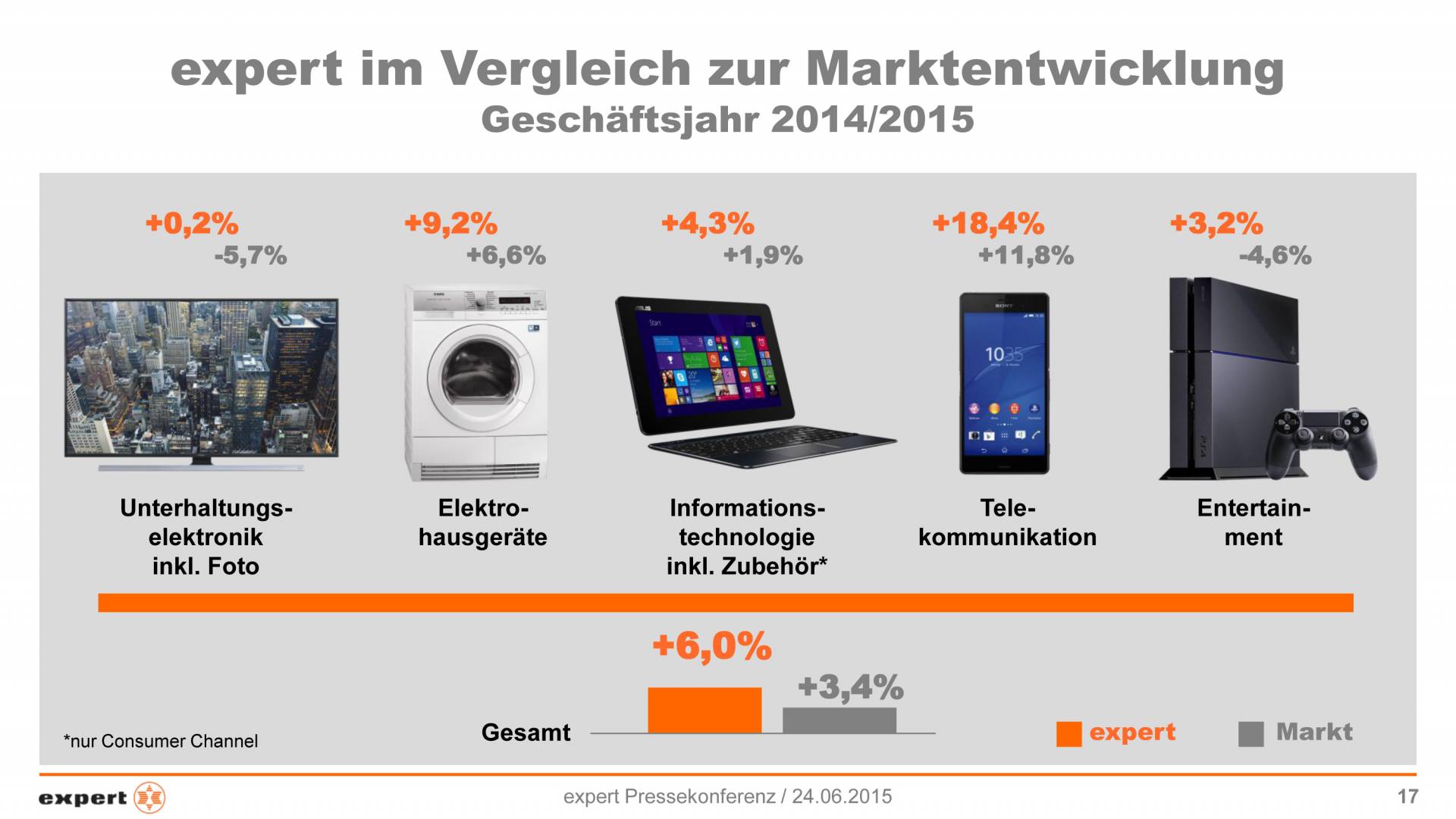 Entscheider Treiber für den expert-Umsatz ist neben der Telekommunikation, die aufgrund der hohen Nachfrage nach Smartphones um 17,8 % wuchs, die Produktgruppe Elektrohausgeräte. Diese ist bereits im Geschäftsjahr 2013 / 2014 um satte 6,1 % auf 566,9 Millionen Umsatz gewachsen. Aktuell konnte die Elektrosparte nochmals eine Schippe drauflegen und einen Umsatz von 611,3 Millionen Euro verbuchen, ein deutlicher Schub um 7,8 %. Hält diese Entwicklung an, dann dürfte die Kategorie Elektro in Kürze die Sparte Unterhaltungselektronik inkl. Foto mit jetzt 620,6 Millionen Euro von Platz 1 verdrängen. Zur Ehrenrettung der UE sei gesagt, trotz des schwierigen Marktumfeldes, konnte ein respektables Wachstum von 1,7 % erzielt werden.