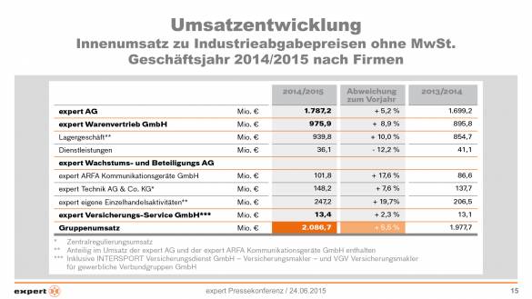 Auch die expert-Gesellschafter dürfen sich über das gute Ergebnis freuen, was auch zu einem großen Teil ihr Verdienst ist. Sind sie gut im Markt unterwegs, dann schlagen sich ihre Aktivitäten mit einem erhöhten Warenbezug bei der Zentrale nieder. So erhielten die expert-Gesellschafter im Geschäftsjahr 2014 / 2015 eine satte Gesamtausschüttung in Höhe von 192,8 Millionen Euro (Vorjahr 184 Millionen Euro). Zusätzlich wird den Aktionären auf der diesjährigen Hauptversammlung eine Dividende von 235,50 Euro pro Aktie vorgeschlagen. Wie bereits schon Ende März kommuniziert, hat die expert AG im Rahmen einer Kapitalerhöhung von 5,5 Millionen Euro ihr Aktienkapital auf insgesamt 39,3 Millionen Euro aufgestockt.