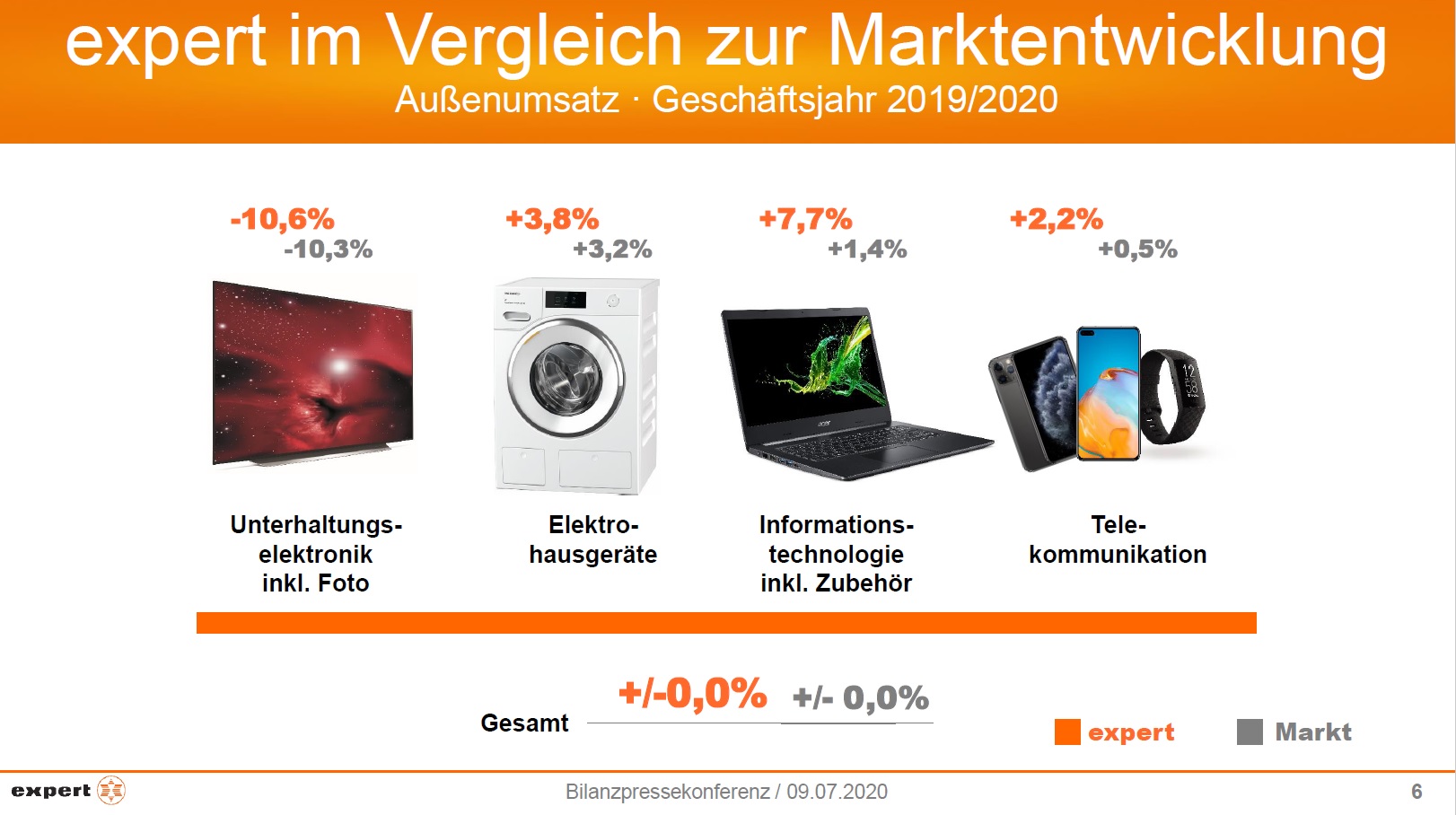 Während der Lockdown-Phase hat sich insbesondere der dezentrale expert-Ansatz – also stationäres Geschäft in der Kombination mit regionalem und überregionalem Online-Auftritt – bewährt. Mit Hilfe dessen konnte die expert-Gruppe die Belastungsprobe gemeinschaftlich erfolgreich bewältigen. Hinsichtlich des Konjunkturpakets der Bundesregierung und gemäß der Fokussierung auf den Kunden empfiehlt expert ihren Gesellschaftern, die Senkung des Mehrwertsteuersatzes direkt an ihre Kunden weiterzugeben. Dr. Müller: „Die Mehrwertsteuer-Umstellung scheint uns einen Push zu geben.“