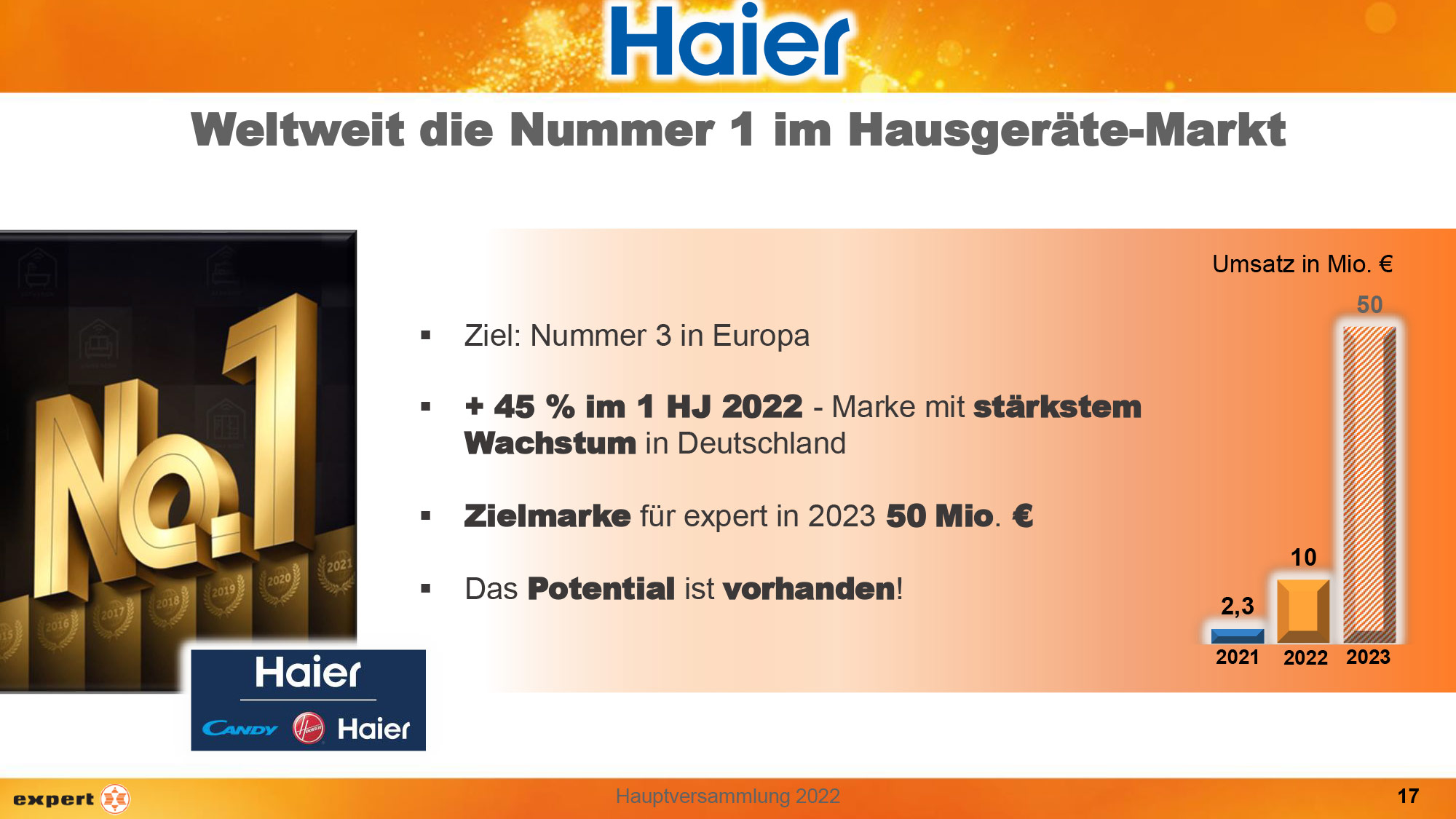 Eine partnerschaftliche Zusammenarbeit mit den Industrie- und Dienstleistungspartnern sowie das regelmäßige Bewerten möglicher neuer Partner sind ein weiterer elementarer Stützpfeiler für expert. Nun investieren expert und Haier, weltweit die Nummer 1 im Hausgeräte-Markt mit dem Ziel, die Nummer 3 in Europa zu werden, in die Partnerschaft und sehen ein großes Potential für die gemeinsame Zusammenarbeit. Nach 2,3 Mio EUR Umsatz mit Haier in 2021 und 10 Mio. EUR im laufenden Jahr sind 50 Mio. EUR Umsatz mit Haier im kommenden Jahr 2023 die Zielmarke für expert.