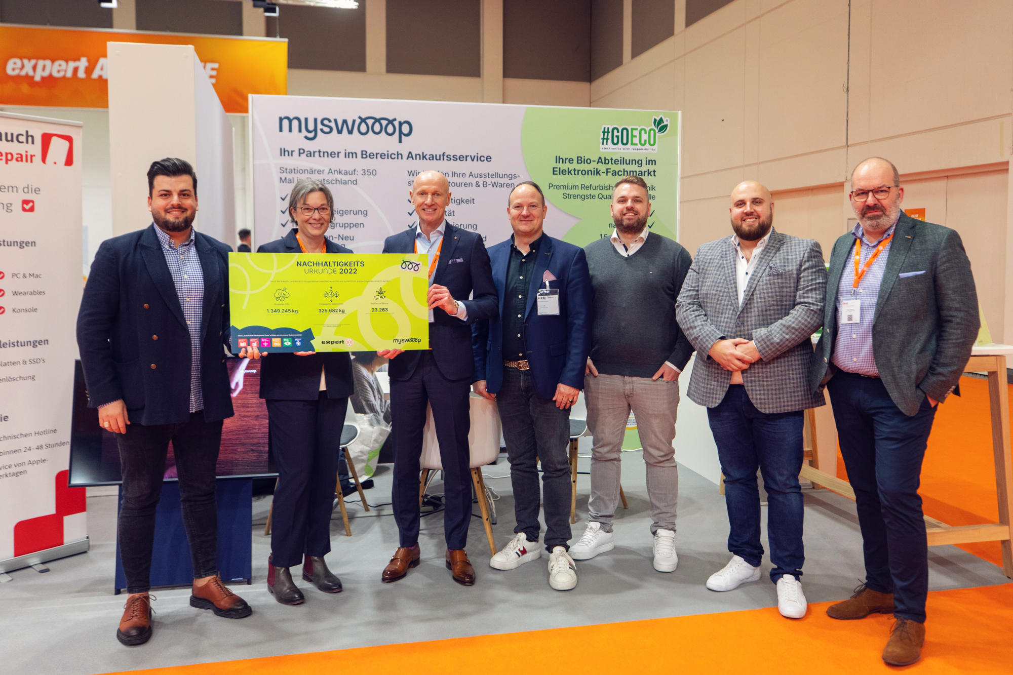Zum Auftakt hat Simon Gabriel, CEO von mySwoop, den langjährigen Geschäftspartner expert für sein Engagement ausgezeichnet und Frank Harder, expert Vorstand für Vertrieb, Marketing und E-Commerce, erneut die mySwoop-Nachhaltigkeit-Urkunde überreicht.
