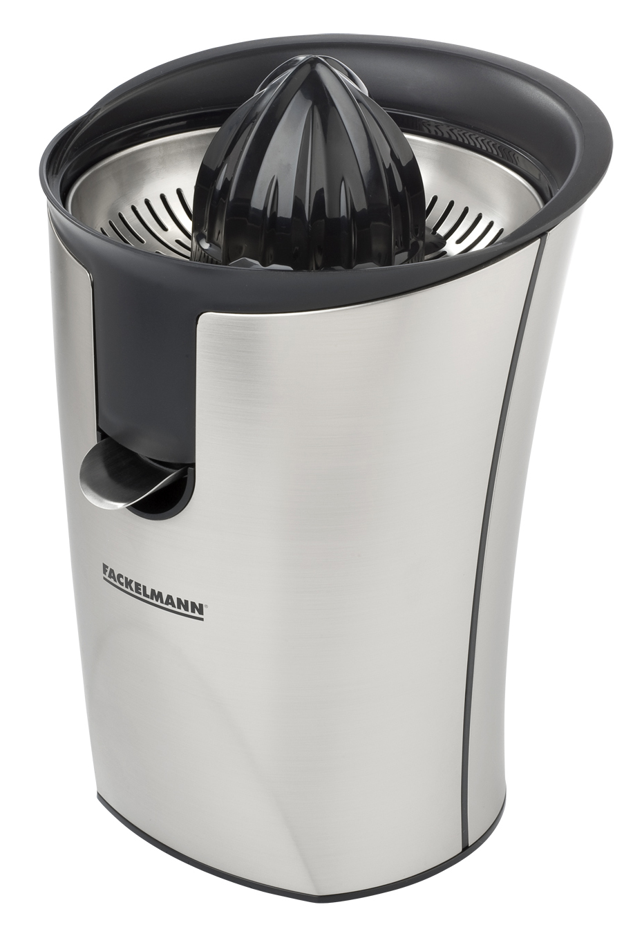 Die Fackelmann Zitruspresse in Edelstahl hat eine Leistung von 100 Watt. Die Ausstattung entspricht dem Modell in Kunststoff.
