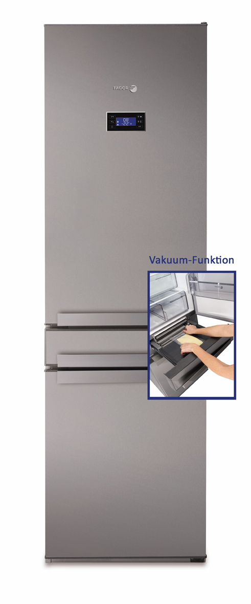 Die Fagor FFK 6845 VX Kühl-Gefrierkombination verlängert die Haltbarkeit von Lebensmitteln bis zu 5 mal, so der Hersteller. So kann Fisch 4 bis 5 Tage aufbewahrt werden; Fleisch ist 15 bis 20 Monate haltbar.