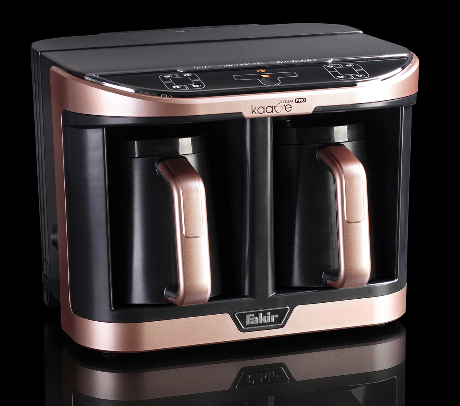 Die Fakir Mokkamaschine Kaave Dual Pro verfügt über zwei Kochkammern, so dass geleichzeitig 8 Tassen Kaffee zubereitet werden können. Dafür stehen zwei Zubereitunskammern mit separaten Kannen zur Verfügung. Gesteuert wird die Maschine über ein beleuchtetes Touch-Bedienfeld.