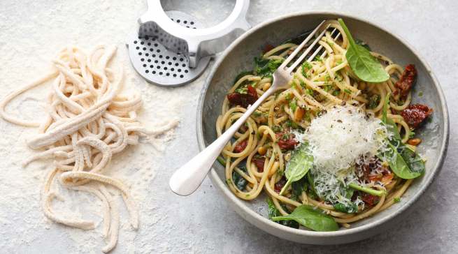 Selbstgemachte Spaghetti mit jungem Spinat