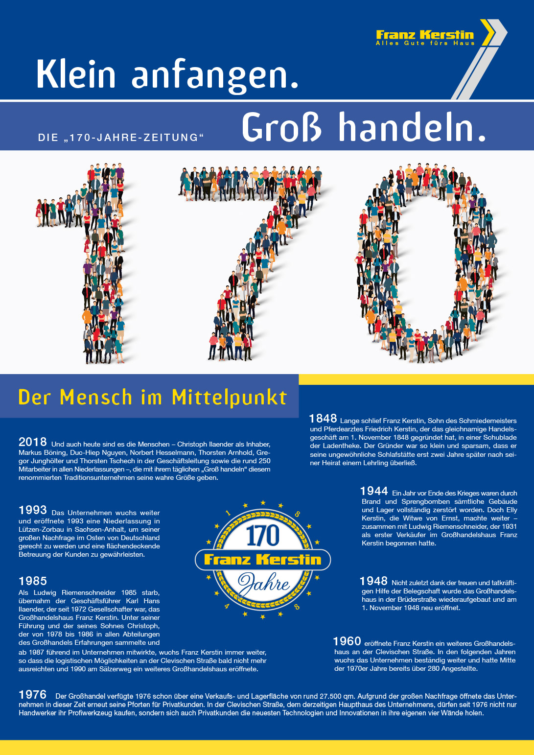 Heute am Donnerstag (8.11.) ist es soweit: Das mittelständische Großhandelsunternehmen Franz Kerstin aus Soest feierte sein 170-jähriges Bestehen. Mit verkaufsstarken Sortimenten, geschulten Mitarbeitern, schnellen Entscheidungswegen und mit einer bundesweiten Lieferung in 48 Stunden ist Kerstin auch mit großer Vergangenheit bestens für die Zukunft aufgestellt. So ist der B2B-Online-Shop mit Zugriff auf 100.000 Lagerartikel und rund eine Millionen Bestellartikel die neue Herzkammer des Großhändlers.
