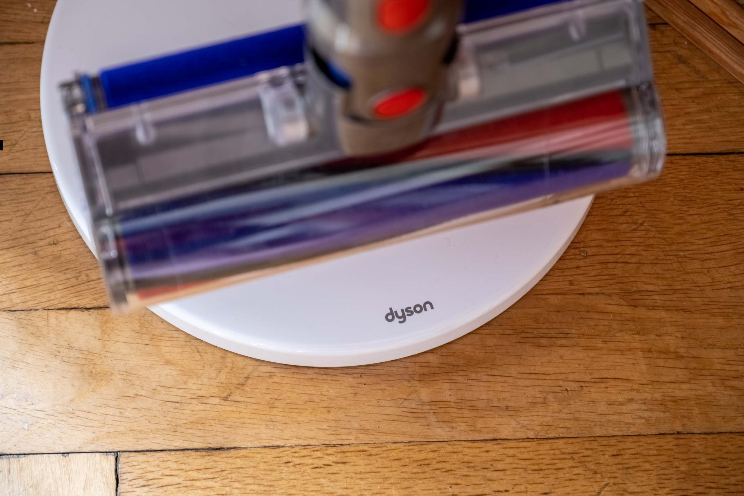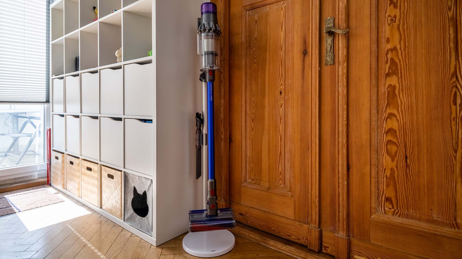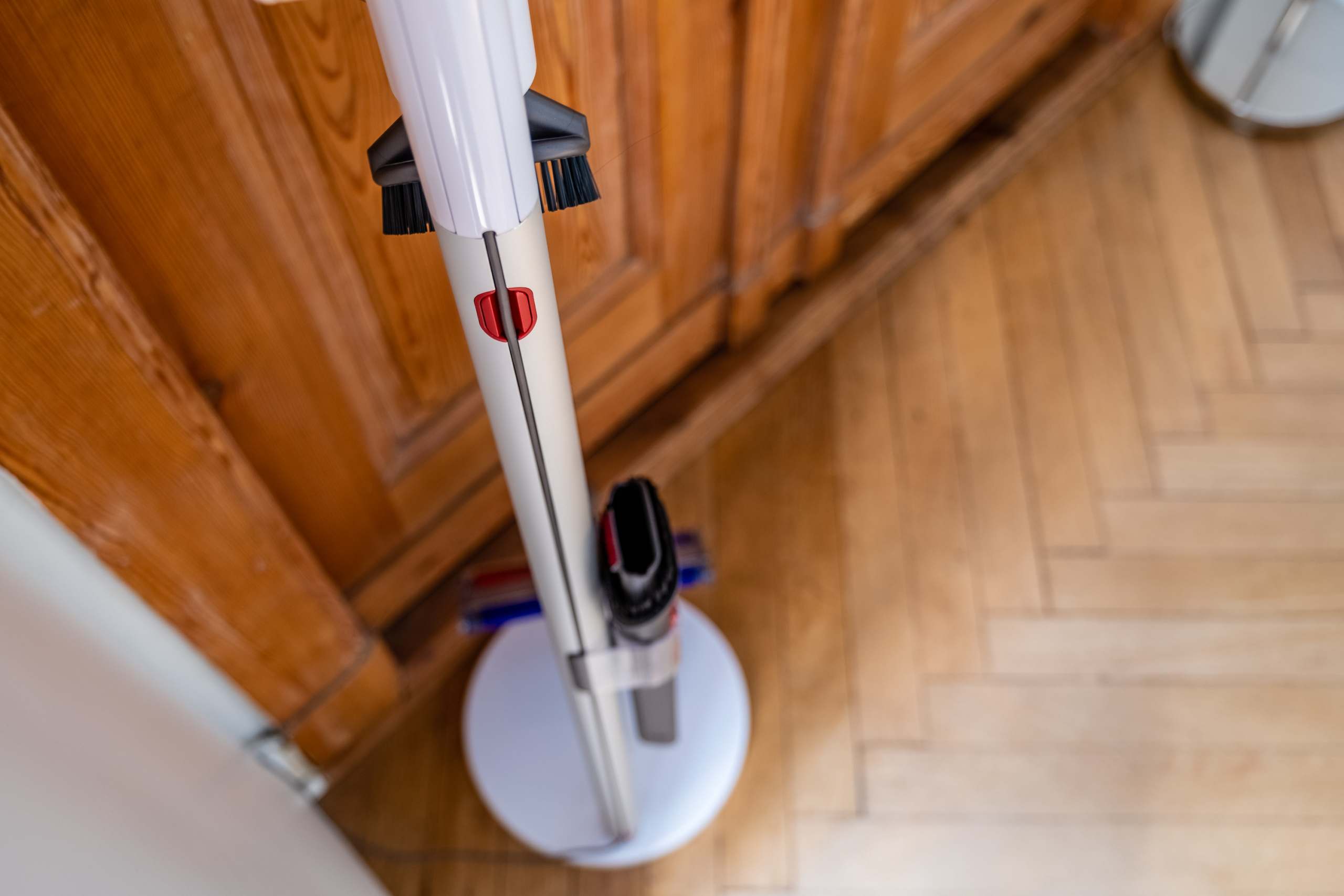 Im Lade-Dock rastet der Dyson V11 Staubsauger mühelos ein, ist jederzeit griffbereit und der Akku ist immer voll geladen.