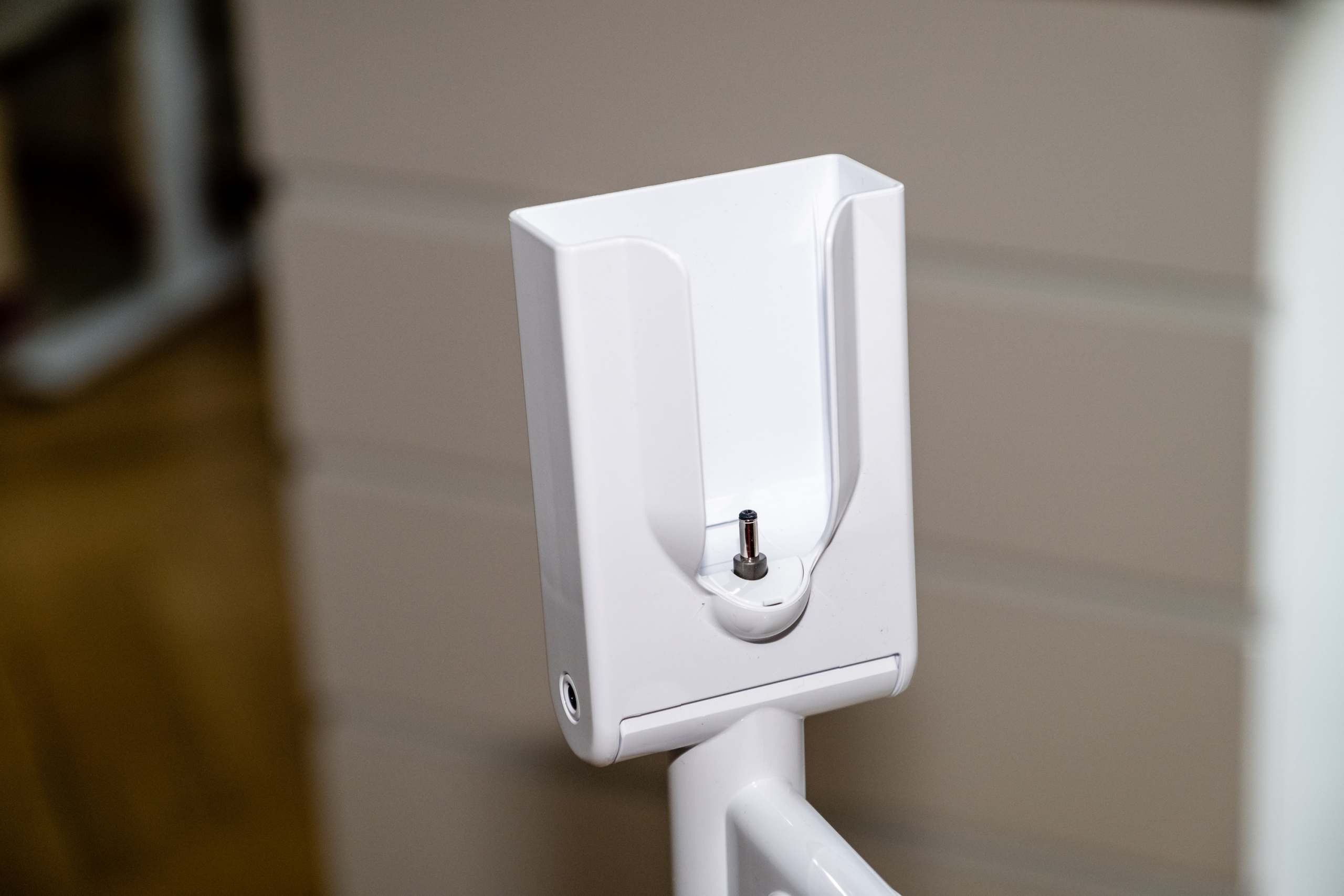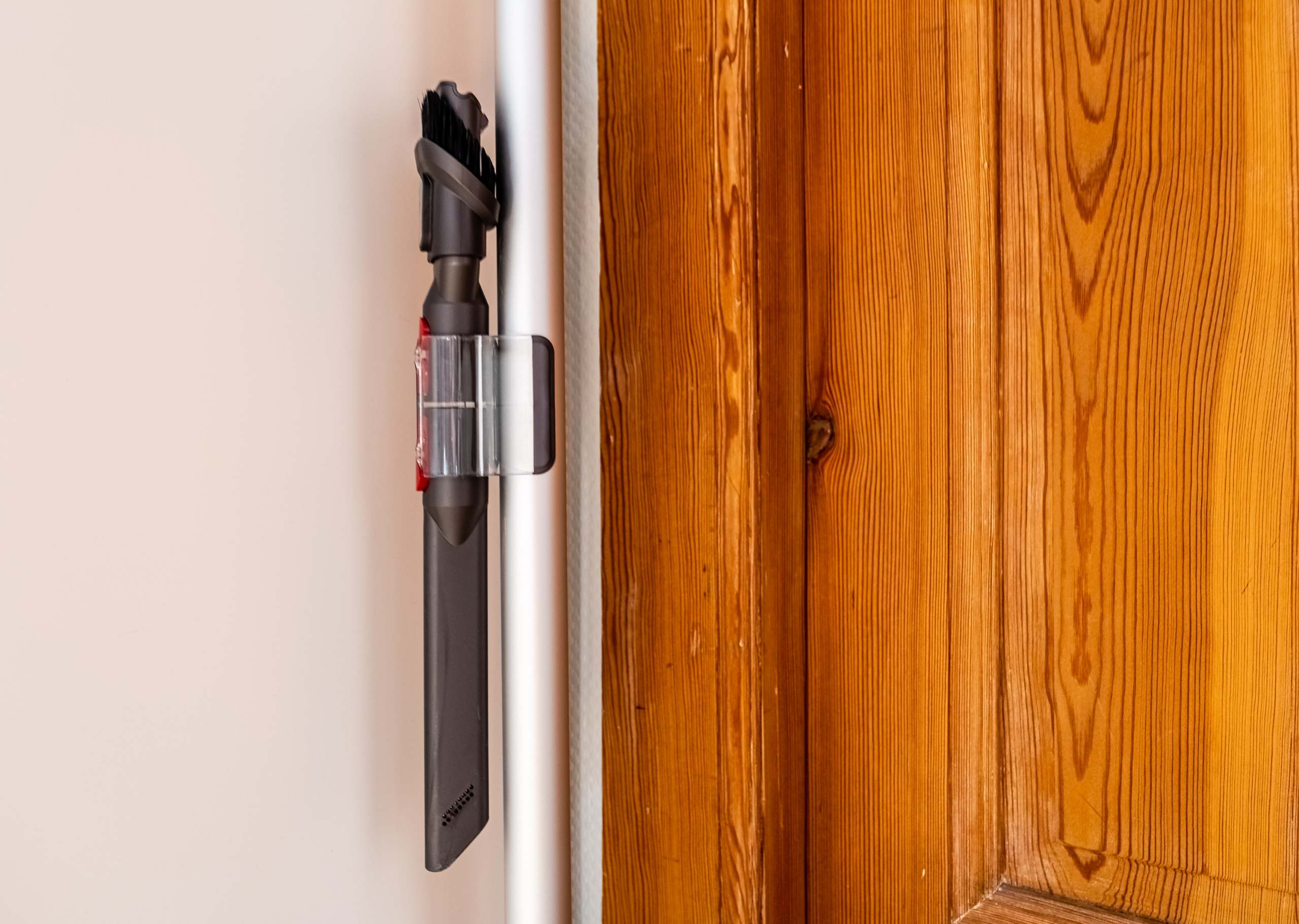 Neben dem Staubsauger selbst finden auch noch bis zu drei Zubehörteile Platz an der Docking-Station. Ein Clip für Zubehör befindet sich direkt im oberen Bereich und ist integriert: