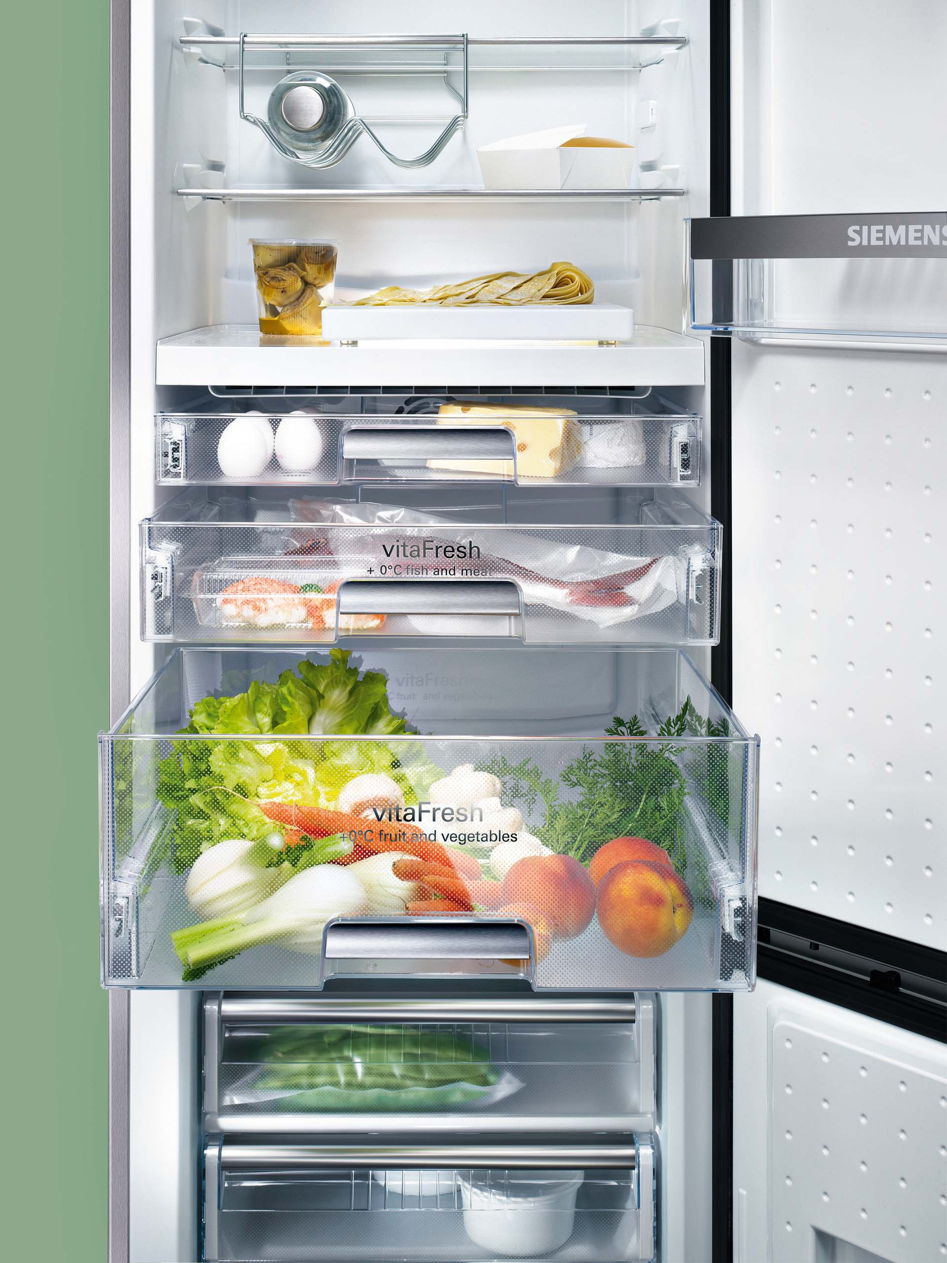 Ungeschlagener Spitzenreiter bei der Frischhaltung bleibt die vitaFresh Kühltechnik. Bei Temperaturen nahe 0°C herrschen hier Bedingungen wie im professionellen Kühlhaus. Denn knapp oberhalb des Gefrierpunktes verlangsamen sich biologische und chemische Verfallsprozesse deutlich. So bewahrt Frisches länger Nährstoffe, Vitamine, Farbe und Konsistenz wie frisch vom Markt. Fleisch und Fisch halten in der so genannten trockenen vitaFresh Zone bei 50 Prozent Luftfeuchtigkeit bis zu dreimal länger. Lammkoteletts sind darin beispielsweise noch nach sieben – statt nur zwei – Tagen saftig und gut. Gleiches gilt für die meisten Obst- und Gemüsesorten in der vitaFresh-Zone „taufrisch“. Bei einer Luftfeuchtigkeit von bis zu 90 Prozent lässt beispielsweise die Bissfestigkeit von Feldsalat- Blättern nicht so schnell nach. Und Nektarinen behalten ganze 28 Tage lang ihr appetitliches Aussehen, statt nur eine Woche. Anspruchsvolle Technik für anspruchsvolle Lebensmittel Ein spezielles Feuchtekontrollsystem mit halbdurchlässiger Membran in der vitaFresh-Zone „taufrisch“ garantiert dabei, dass die hohe Luftfeuchtigkeit bei Obst und Gemüse konstant bleibt. Zusätzlich macht sie ein separater Kältekreislauf komplett unabhängig von den übrigen Kühlbereichen. Und schließlich garantiert auch noch ein Außentemperatur-Fühler, dass im Kühlschrankinneren stets die vorgeschriebene Temperatur herrscht – für beste Lagerbedingungen und optimalen Energieeinsatz.
