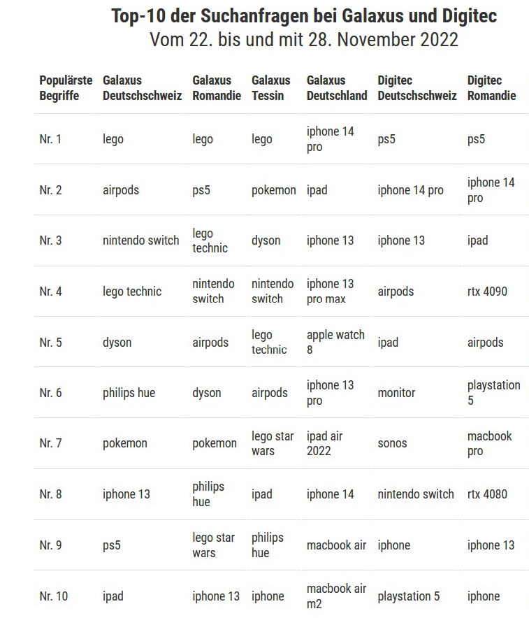Zu diesem Ergebnis kommt das Suchverhalten der Kundschaft von Galaxus und Digitec, in der Woche vom 22. bis und mit 28. November.