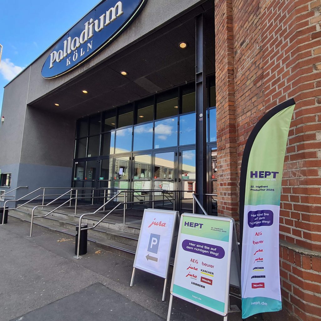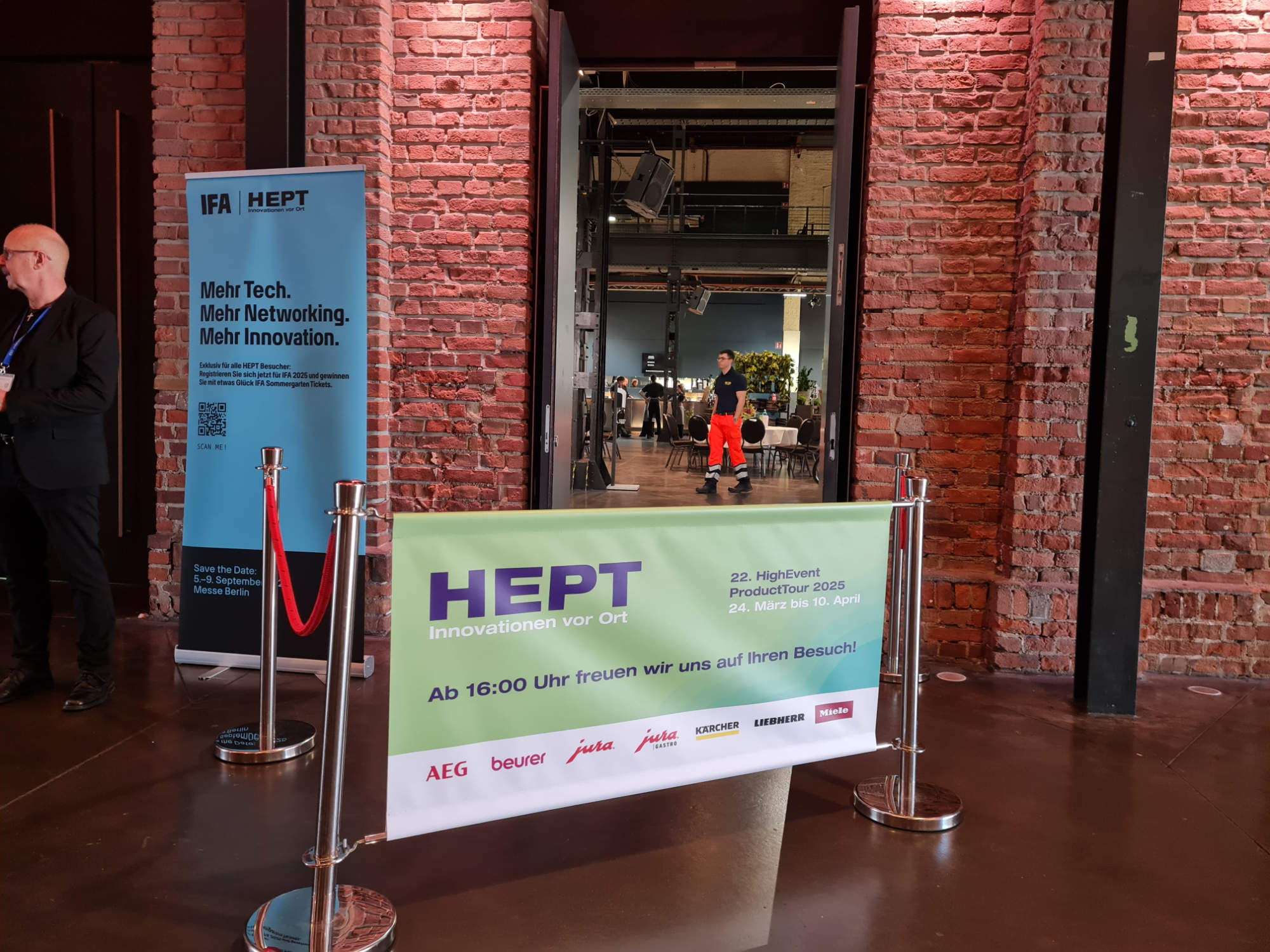Das HEPT-Feeling startet bereits bei der Anfahrt zur Location inklusive Parken: Alles perfekt und durchdacht. Der Empfang in der Halle: Immer freundlich und kompetent. Die Locations: allesamt beindruckende Hallen, oft mit dem Charme vergangener Industriearchitektur. Die Atmosphäre: Absolut entspannt und unaufgeregt. Schließlich die Auftritte der sieben Aussteller (AEG, Beurer, Jura, Jura Gastro, Kärcher, Liebherr und Miele): Eine perfekte, sich kongenial ergänzende Mischung für Neuheiten, POS-Aktionen und Networking. Und nicht zuletzt das Catering: Da blieben, auch mit regionalen kulinarischen Reminiszenzen, keine Wünsche offen. Ein Fest für Auge und Gaumen.