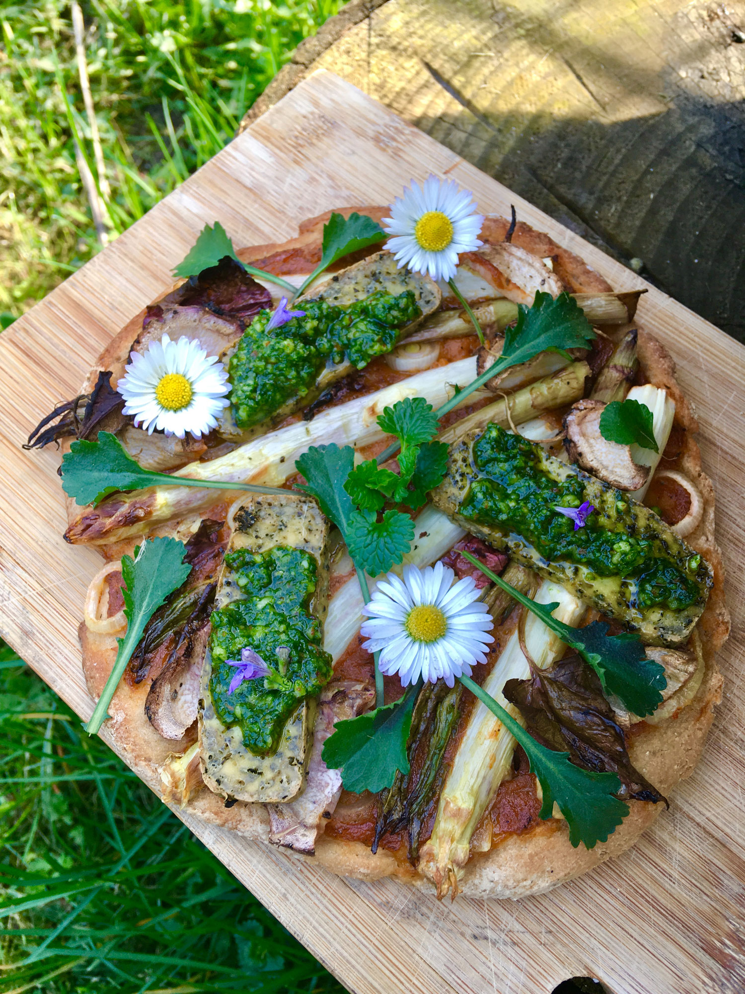 Die Wildkräuter verlesen und waschen. Das Bärlauchpesto in Klecksen auf der Pizza verteilen. Mit Wildkräutern und Blüten garnieren.