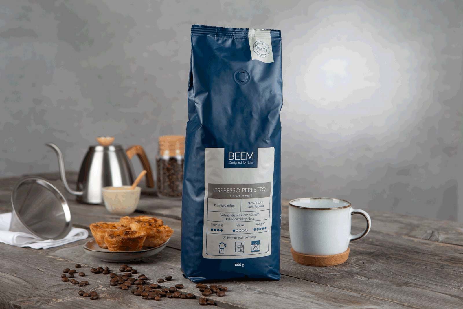 Die optimalen Kaffeebohnen für dieses Gerät gibt es ebenfalls bei Beem: Espresso Perfetto sowie Cafe Crema. Die ganzen Bohnen des Espresso Perfetto bieten dank einer Mischung aus 60 Prozent Arabica Bohnen und 40 Prozent Robusta Bohnen einen vollmundigen Geschmack mit einer würzigen Kakao-Whiskey-Note, bestechen aber gleichzeitig mit ihrem niedrigen Säuregehalt. Wer es fruchtiger mag, für den ist der Cafe Crema mit seinen leichten Karamell- und Schokoladen-Noten die richtige Wahl.