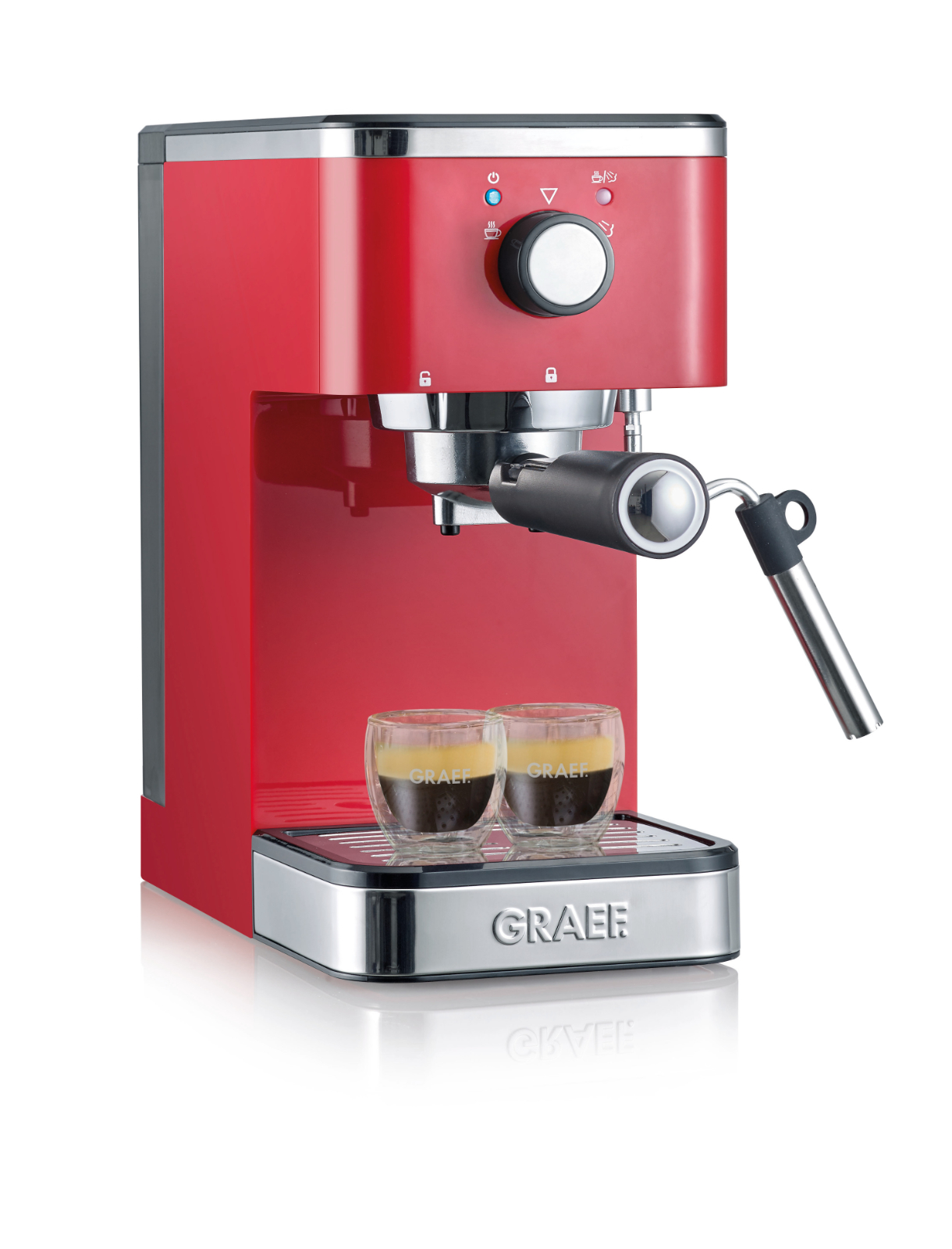 Optisch ein Hingucker in den Farben Schwarz, Rot und Weiß kann sich auch das Innenleben der kleinsten Siebträgermaschine von Graef sehen lassen. Ihr schnell aufheizender Thermoblock bringt das Wasser rasch auf die richtige Temperatur, die 15-Bar-Pumpe sorgt für den richtigen Espresso-Druck. Als Zubehör gibt es einen Kaffeelöffel und zweiwandige Siebe, die das Kaffeepulver für eine oder zwei Tassen Espresso aufnehmen. Die Warmhalteplatte für die Tassen ist ebenso praktisch wie der 1,25 Liter fassende Wassertank und die Abtropfschale, die beide herausnehmbar sind.
