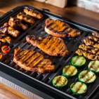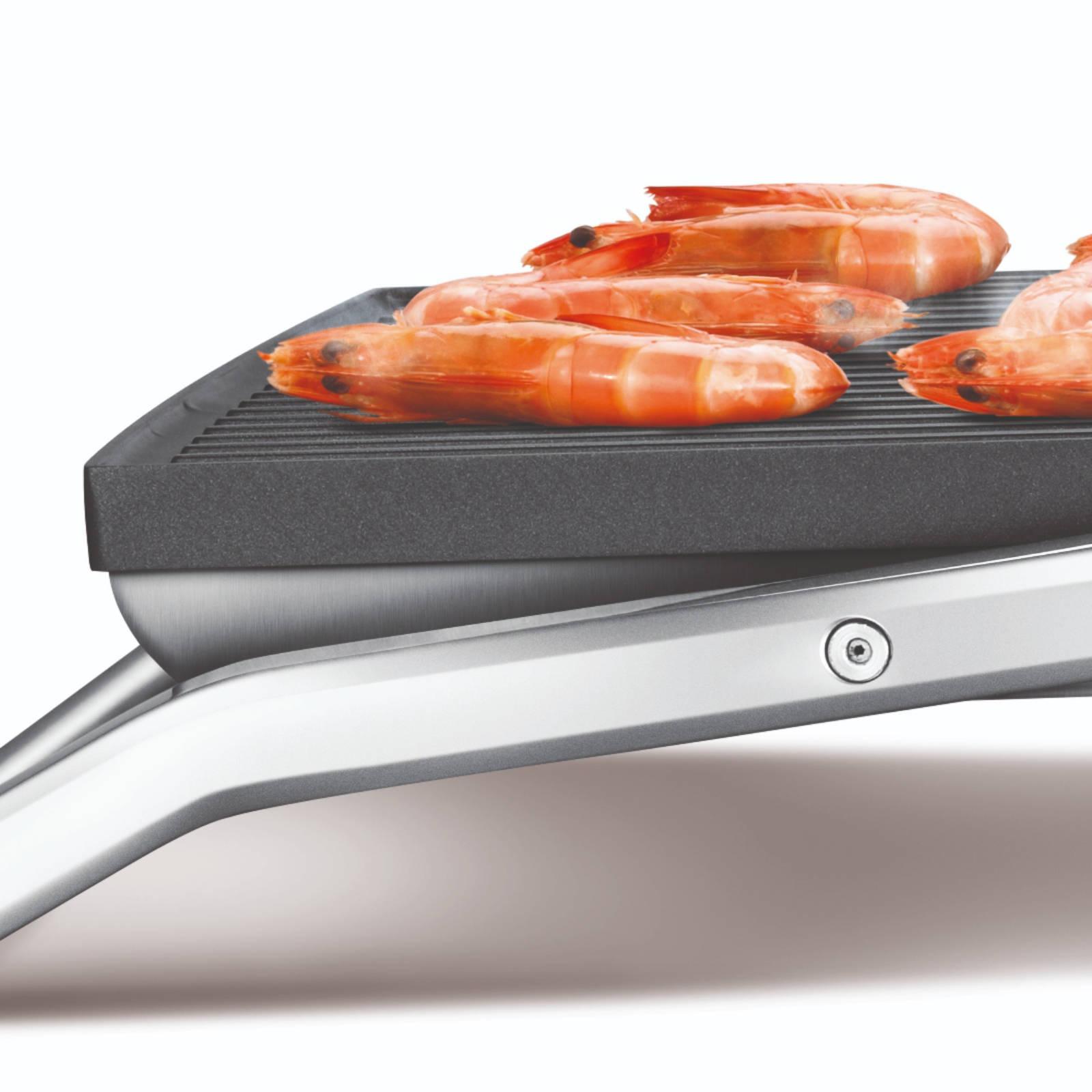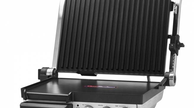 Der BBQ Grill von Sage ist ein Kontaktgrill mit satten 2.400 Watt, der eine Temperatureinstellung zwischen 175°C für Sandwiches und bis zu 235°C für starkes Anbraten für Steaks oder Geflügel bietet. Mit einem Timer (bis 15 Minuten) lässt sich prima die Garzeit steuern. Die Grillplatten können in ihrer Neigung verstellt werden, damit Fett in die herausnehmbare Abtropfschale abfließen kann. Das Schöne ist: Der BBQ Grill ist auch offen einsetzbar und somit ideal für Grillpartys im Freien. Die untere Grillplatte ist glatt, die obere ist gerippt: dieses „Twinplatten“-Design mit Antihaft-Oberfläche erlaubt das Braten von Eiern über Steaks bis hin zu Meeresfrüchten. Weitere Extras: ein LCD-Display, verstellbare Temperatur für Pfannkuchen, getoastete Sandwiches oder Steaks sowie verstellbare Höhe der Grillplatten.