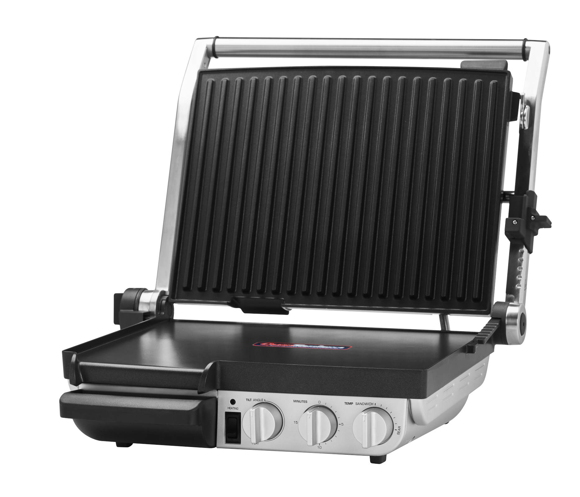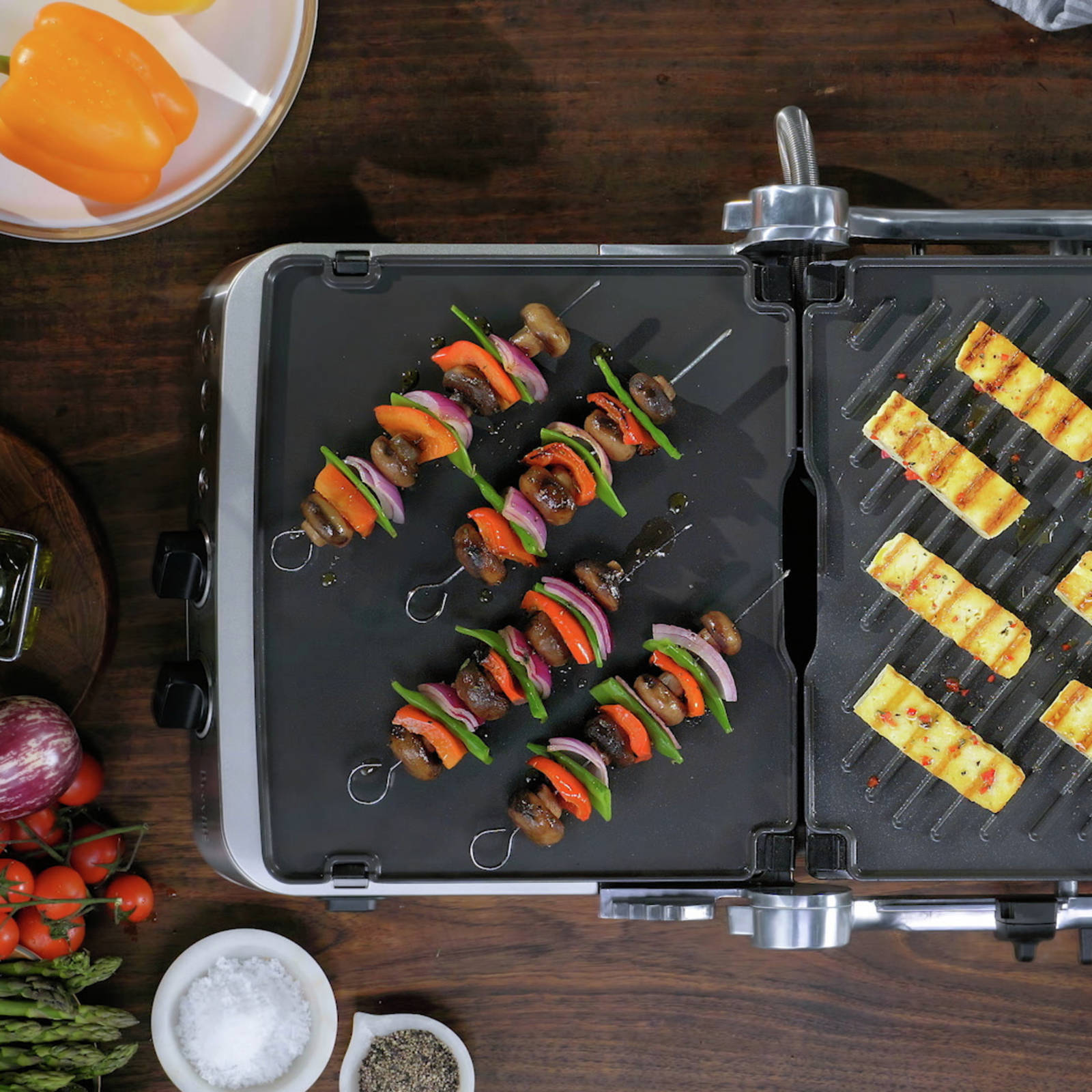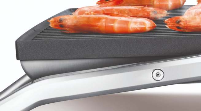 der oberen und unteren Platte lässt sich durch eigene Regler auch individuell einstellen. Ob gerippt oder glatt – die wendbaren Platten können je nach Einsatz ausgewählt werden, zudem sind sie spülmaschinenfest. Ziemlich praktisch!