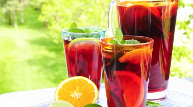 Für die Sangria brauchen Sie tiefgekühlte Gläser, leichten, gut gekühlten Rotwein, die gleiche Menge sehr kaltes Wasser, den Saft von 5 bis 6 ausgepressten Limetten und ca 150 g Zucker.
