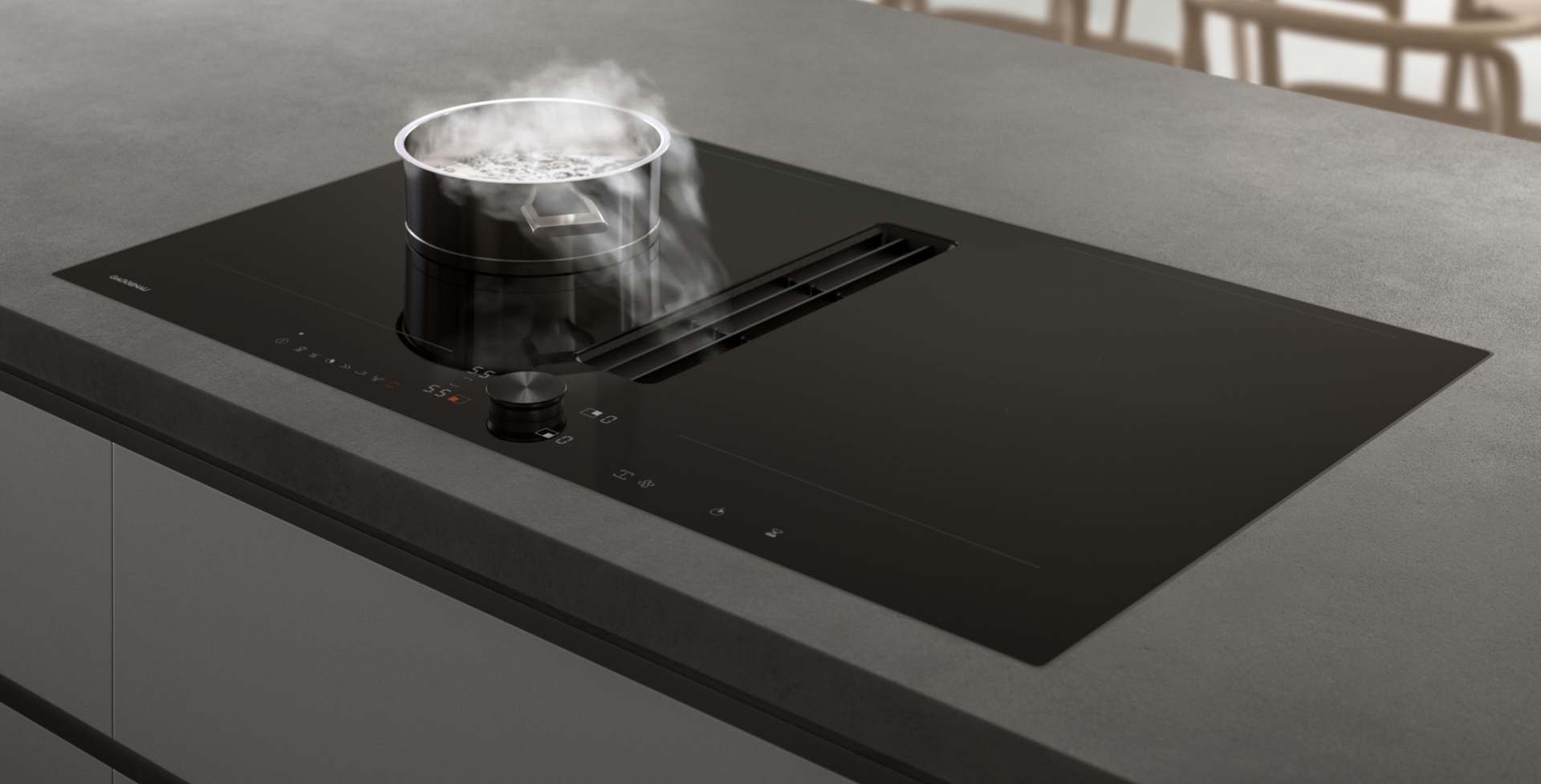 Die integrierte Lüftung saugt Kochdünste und Gerüche direkt an der Kochfläche ab. Besonders komfortabel ist dabei die Automatik-Funktion, die sich bei Nutzung des Kochfeldes einschaltet und mit der sich die Leistung dank eines Sensors laufend selbständig an die Kochdunstentwicklung anpasst.