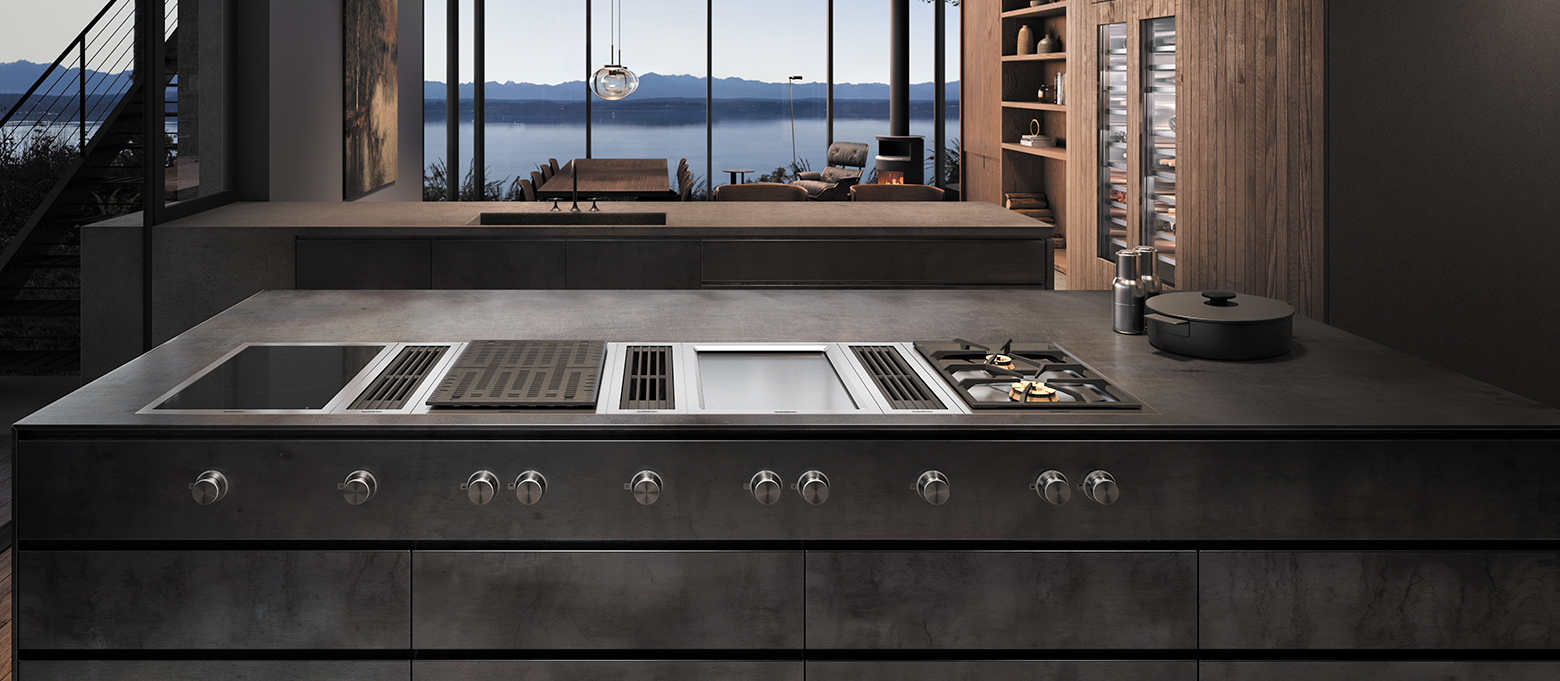 Der Gaggenau Muldenlüfter Vario Serie 400 schützt die Küche und den angrenzenden Wohnraum leise und unaufdringlich vor unerwünschtem Kochdunst und Gerüchen.