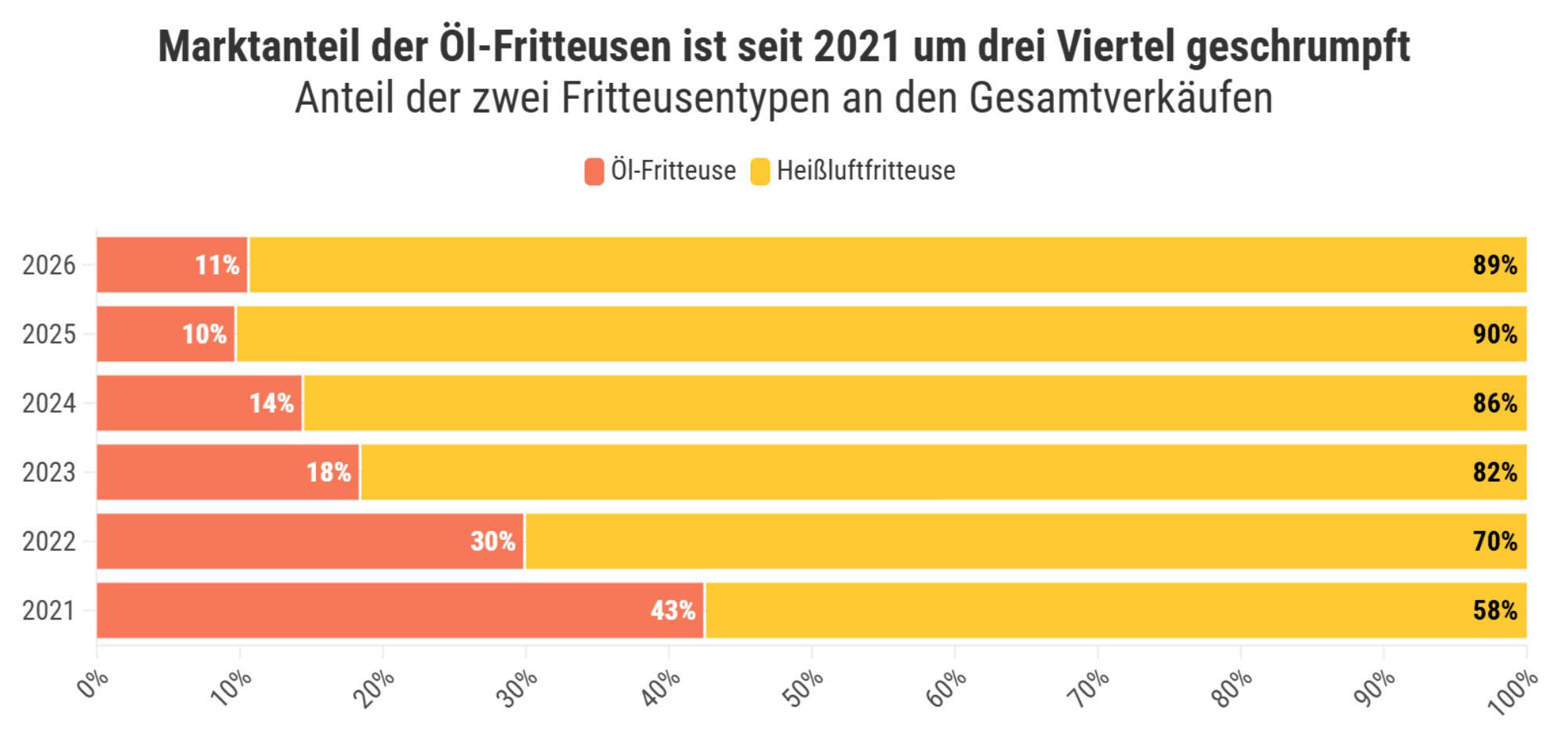 Eine Analyse des Onlinehändlers Galaxus zeigt: Airfryer dominieren den Markt klar. Bereits 2025 entfielen rund 90 Prozent der verkauften Fritteusen auf Heißluftmodelle. Gleichzeitig ist der Absatz klassischer Öl-Fritteusen seit 2021 um drei Viertel eingebrochen. Insgesamt hat sich die Nachfrage nach Airfryern in den vergangenen vier Jahren mehr als versiebenfacht, mit einem Verkaufsplus von 630 Prozent.