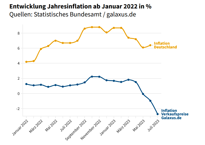 Die Inflation der Preise bei galaxus.de betrug im Schnitt 1,4%, seit dem Angriff Russlands auf die Ukraine. Seit dem Mai dieses Jahres sinken die Preise erstmals wieder.