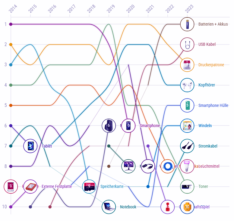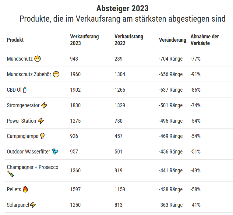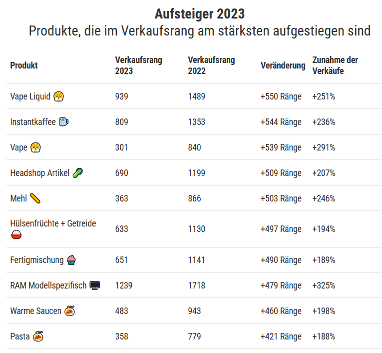 Die Konsumtrends zeigen sich auf den hinteren Rängen: Immer mehr Menschen kaufen im Internet haltbare Lebensmittel sowie Vapes. Schnee von gestern sind dagegen Prepper-Gadgets wie Stromgeneratoren.