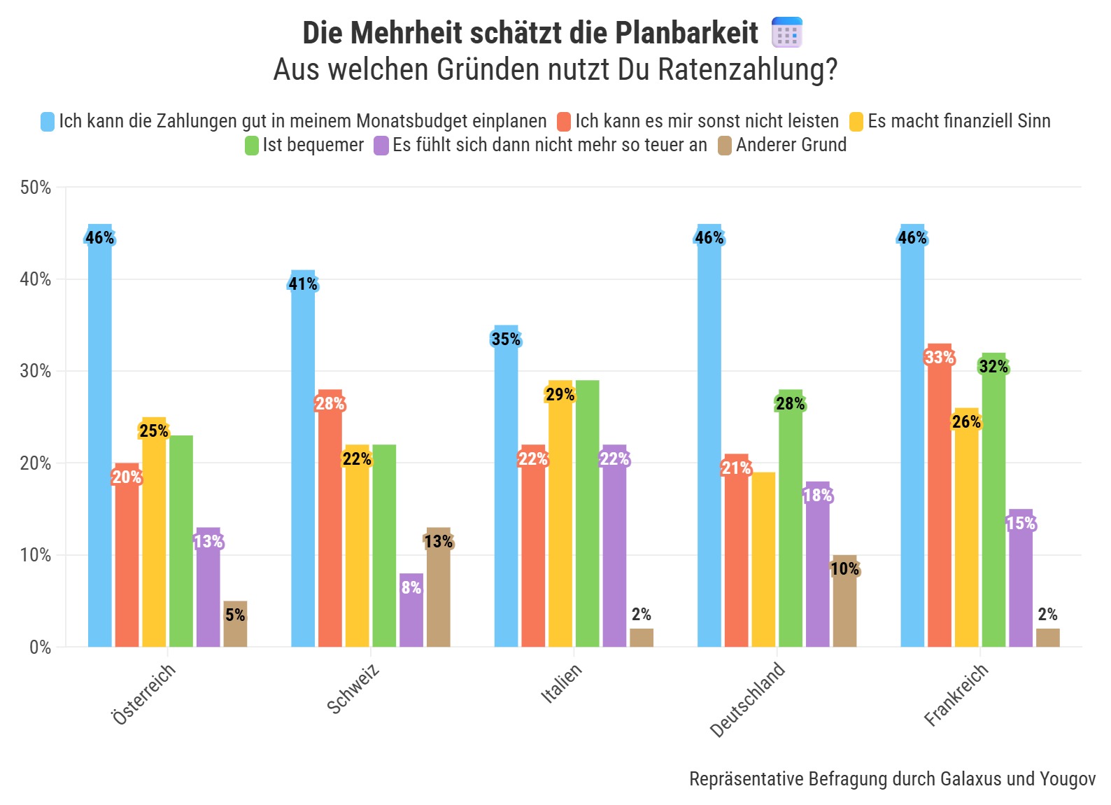 Auffällig sind nationale Unterschiede: Während in Deutschland und Österreich auch Modekäufe häufig finanziert werden, dominieren in Frankreich und Italien Haushaltsgeräte stärker. In der Schweiz wiederum stehen Fahrzeuge im Vordergrund.