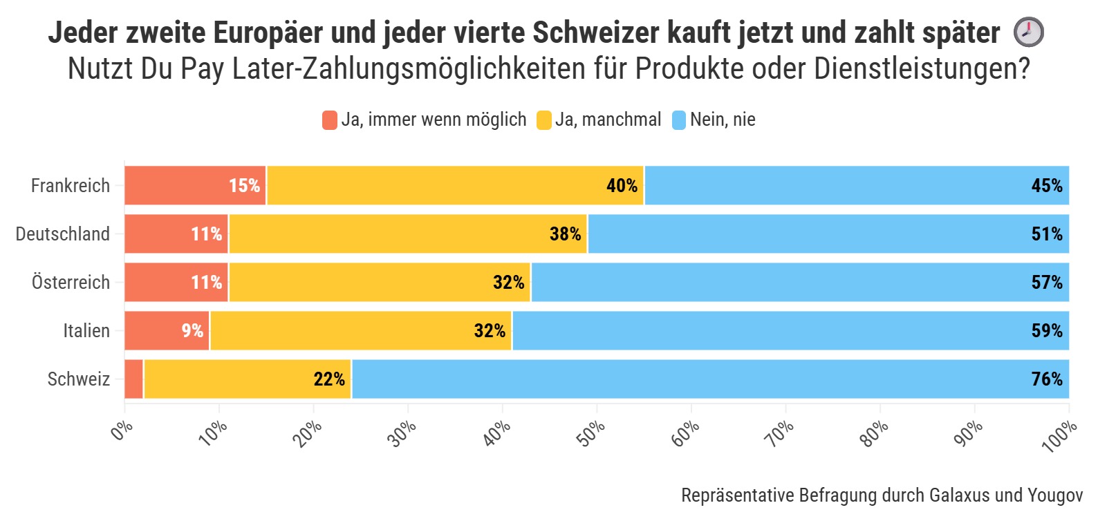 38 Prozent der Befragten in Deutschland geben an, Ratenzahlung manchmal zu nutzen, 11 Prozent immer. Quelle: Galaxus/YouGov