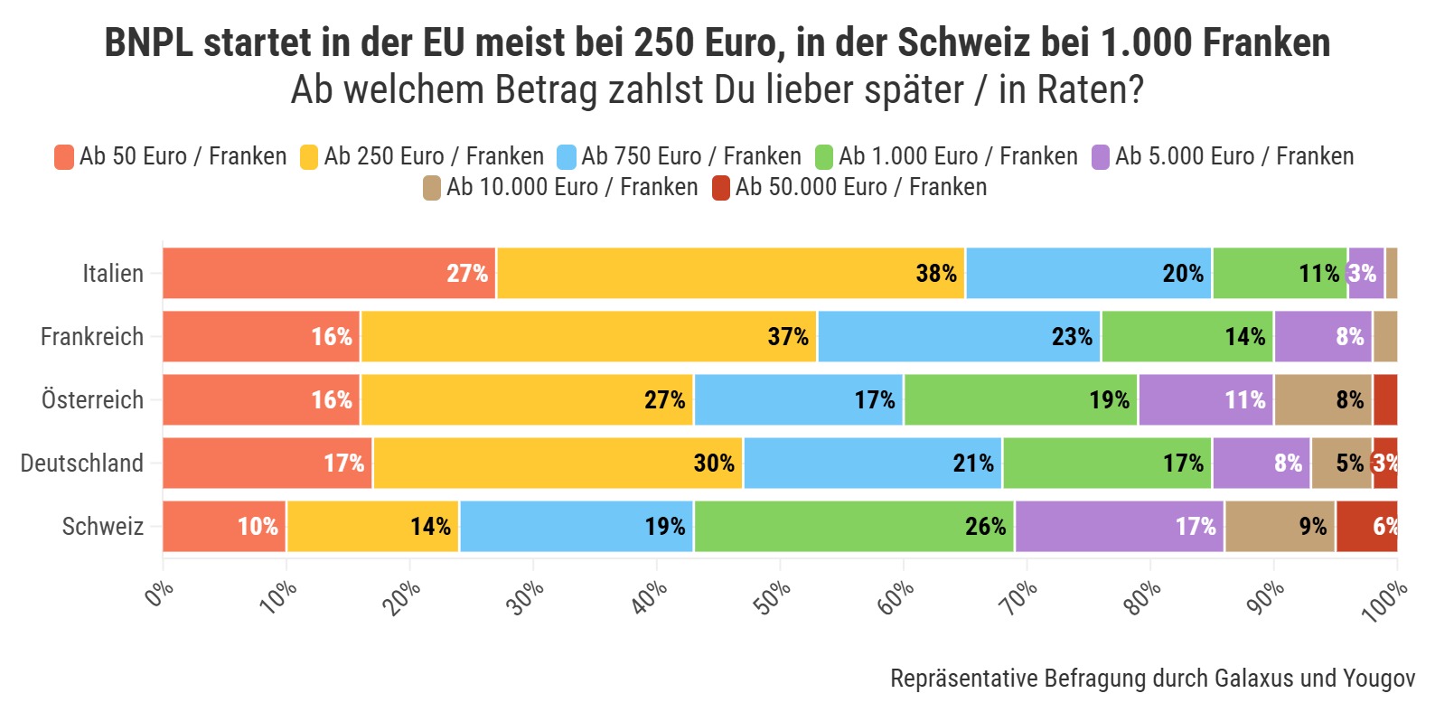 In den meisten europäischen Ländern liegt die Schwelle der Ratenzahlung bei 250 Euro. Quelle: Galaxus/YouGov