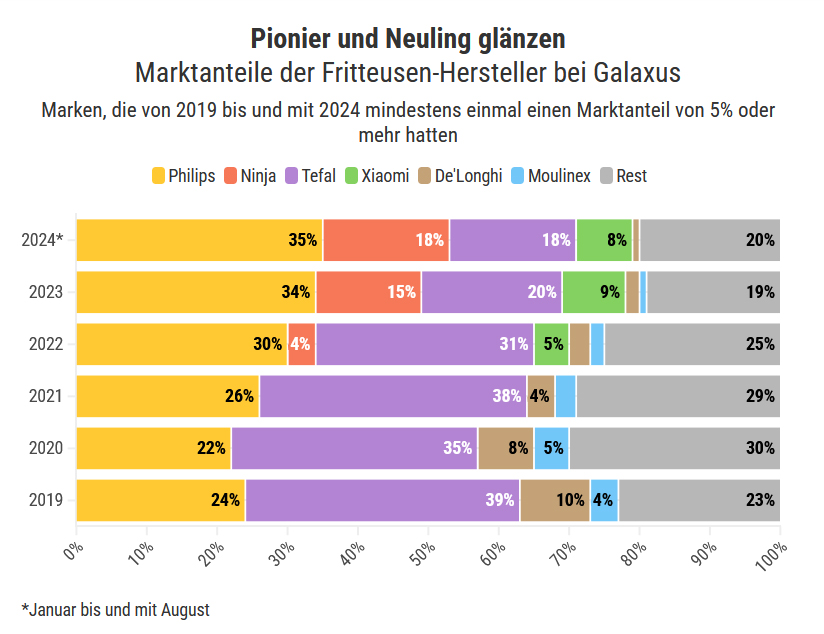 Vom Trend profitieren in Europa vor allem zwei Marken, namentlich der Airfryer-Pionier Philips sowie Ninja. Ninja hat seinen Marktanteil bei Galaxus in weniger als zwei Jahren von 4 auf 18% ausgebaut – auch dank der Unterstützung von Influencern in den sozialen Medien. Philips und Ninja haben dank ihrer Wette auf Air Fryer den früheren Fritteusen-Platzhirschen Tefal auf den dritten Rang verwiesen.