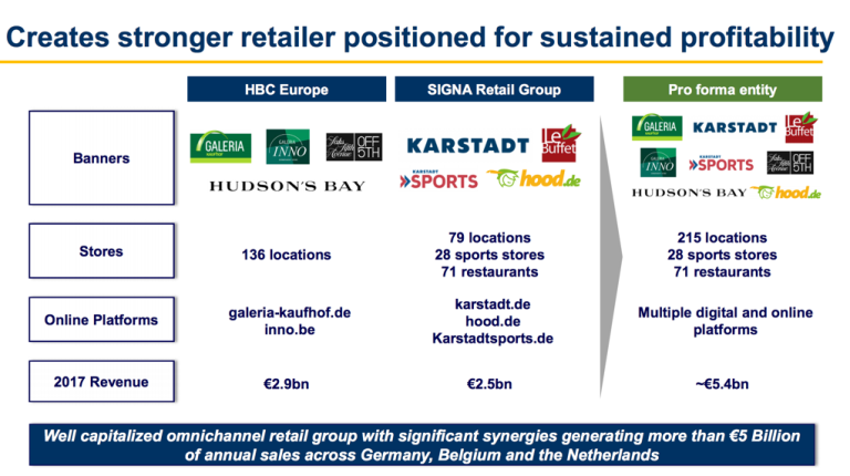 Zum neuen gemeinsamen Unternehmen von SIGNA und HBC gehören die Galeria Kaufhof GmbH, die Karstadt Warenhaus GmbH, das gesamte Einzelhandelsgeschäft von HBC Europe (Saks OFF 5TH, Galeria Inno in Belgien, Hudson‘s Bay in den Niederlanden) sowie auch Karstadt Sports und der gesamte Lebensmittel- und Gastronomiebereich beider Unternehmen (Dinea, Galeria Gourmet, Karstadt Feinkost, Le Buffet). Es verfügt über 243 etablierte Standorte in Innenstadtlagen Europas und beschäftigt insgesamt 32.000 Mitarbeiter. SIGNA Retail wird 50,01 Prozent der Anteile an der Holdinggesellschaft halten und HBC 49,99 Prozent. Das neu entstehende Handelsunternehmen wird von Karstadt-CEO und SIGNA Retail Geschäftsführer Dr. Stephan Fanderl geleitet. Zu seinem Team gehören Führungskräfte von Galeria Kaufhof und Karstadt.
