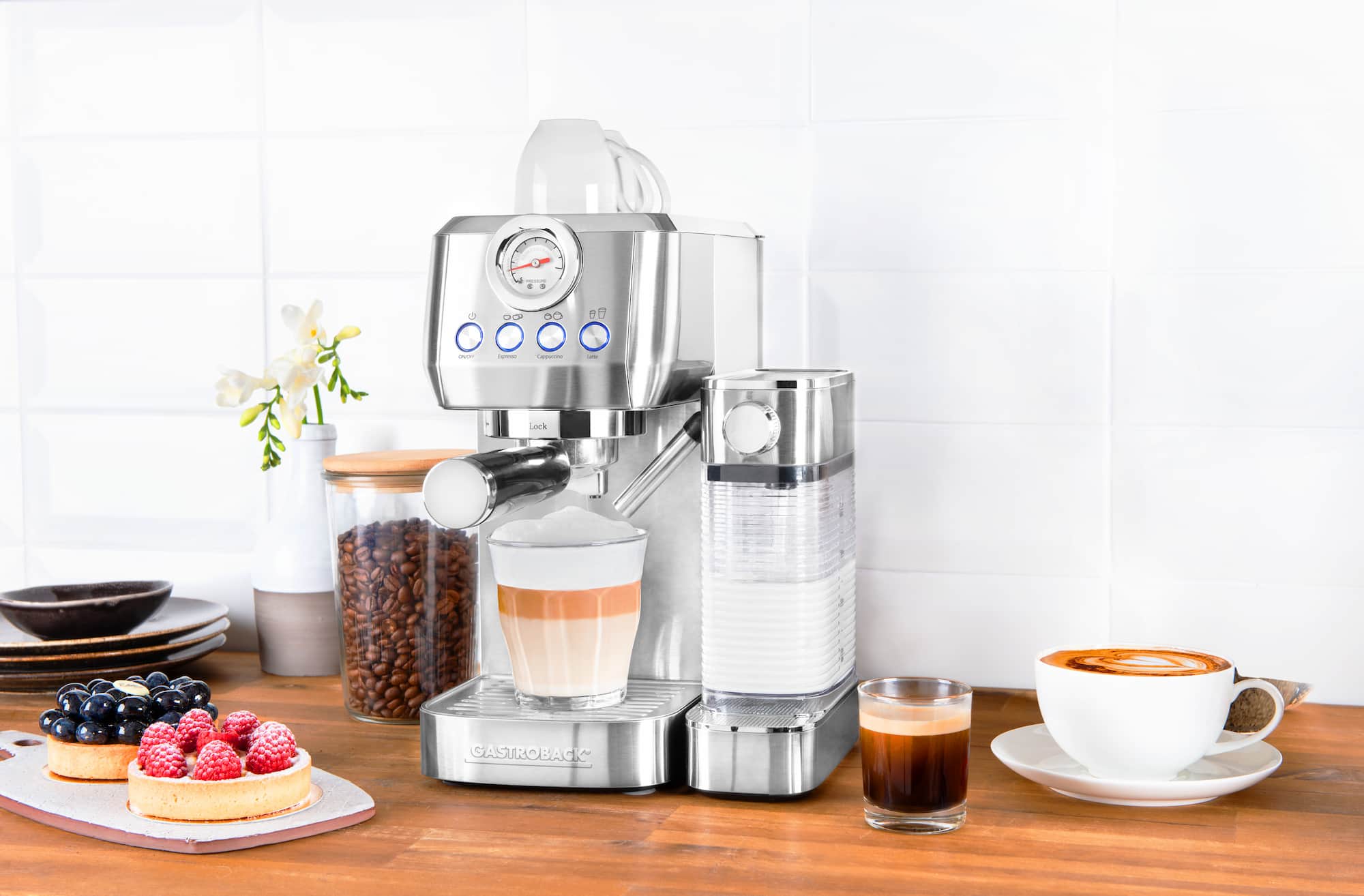 Espressomaschine Design Espresso Piccolo Pro von Gastroback bringt auf Knopfdruck in kürzester Zeit den Geschmack Italiens in die Tasse. Für alle Cappuccino- und Latte Macchiato-Fans liefert die 360° schwenkbare Milchschaumdüse zusätzlich ausreichend Dampfdruck für einen sehr gut texturierten Milchschaum.