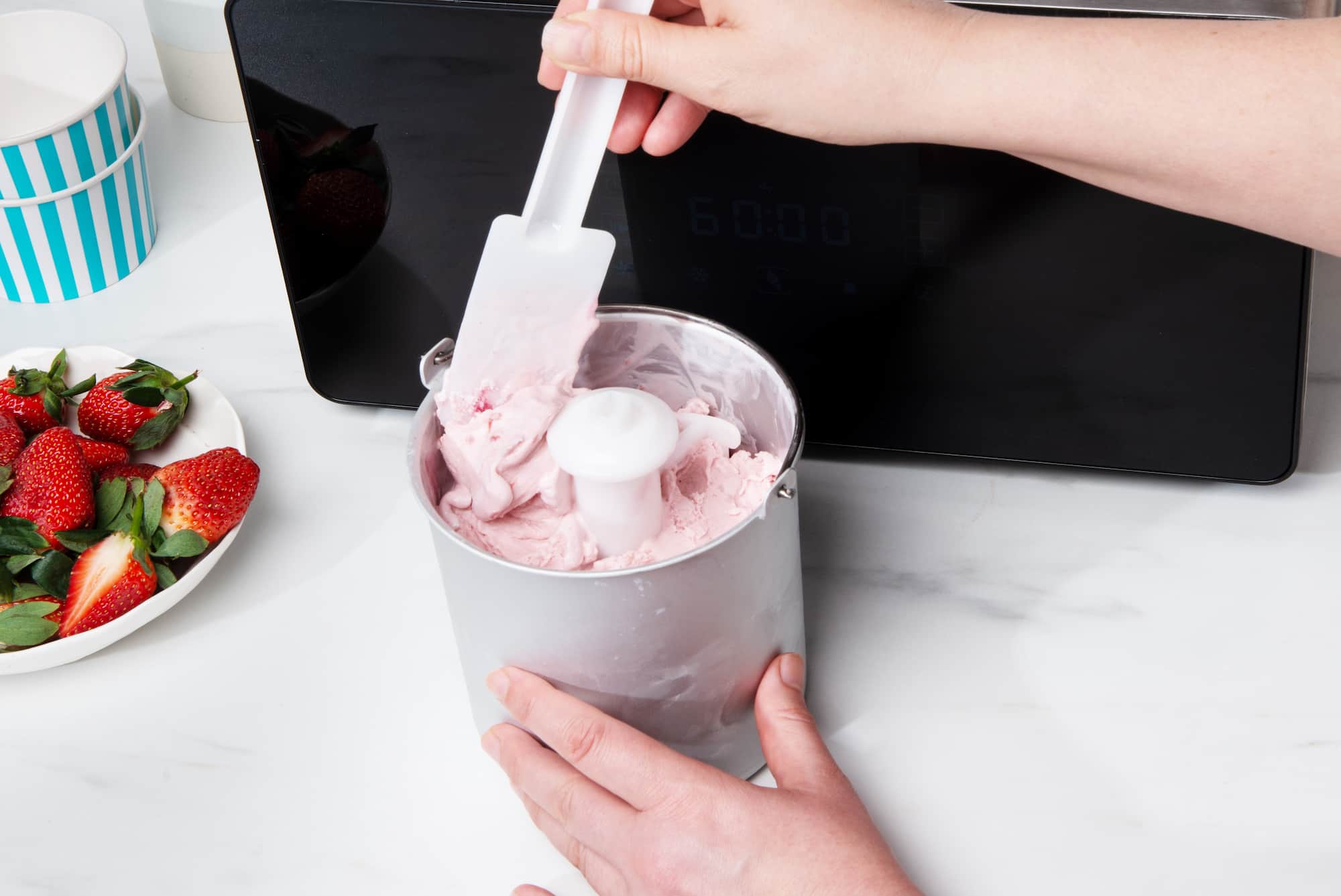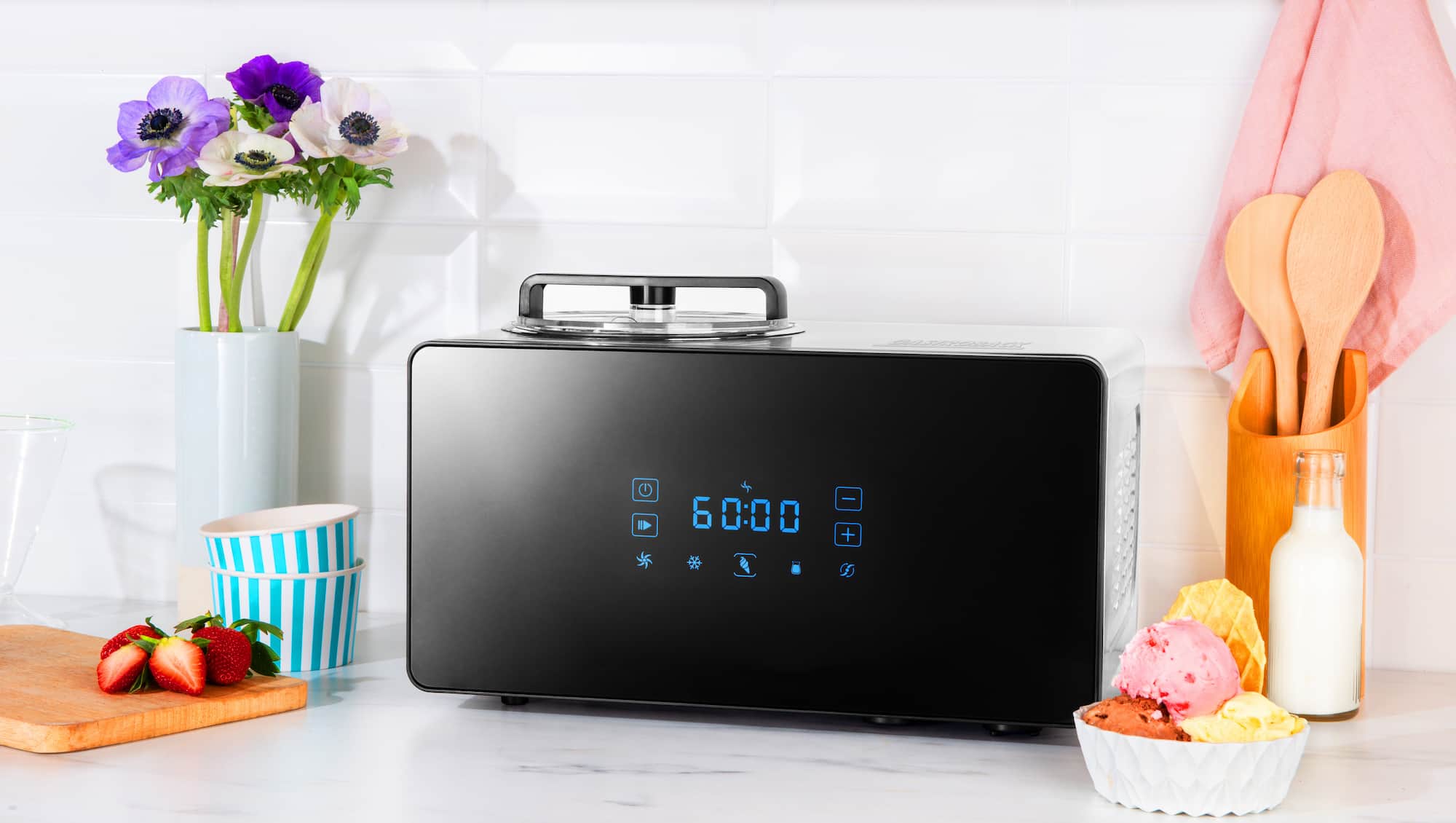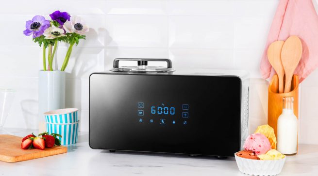 Dank eines effizienten, dennoch leisen 180-Watt-Kühlkompressor ist die Eismaschine in wenigen Minuten auf bis zu -30°C gekühlt und sofort einsatzbereit für bis zu 1,5 Liter Speiseeis pro Stunde. Die Konsistenzkontrolle reguliert die vorab eingestellte Cremigkeit – soft, mittel oder fest. Eine praktische Rührfunktion mischt dabei die Zutaten mit 25, 50 oder 70 Umdrehungen/Min. Je mehr Umdrehungen, desto mehr Luft wird unter die Eismasse geschlagen – für cremigeres Eis, weniger Eiskristalle und intensiveren Geschmack. Gesteuert wird das Multitalent über eine stylische Frontplatte aus Glas mit XL-Touchscreen.