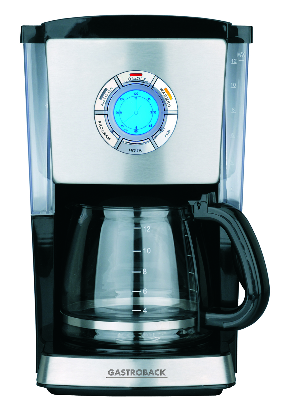 Die Gastroback Design Kaffeemaschine 42700 ist die dritte im Bundle des neuen Gastroback Frühstücksset, neben Toaster und Wasserkocher für Teewasser, alle drei mit schön gestalteten Gehäusen aus gebürstetem Edelstahl. Die Design-Kaffeemaschine ist für 12 Tassen ausgelegt. Sie lässt sich sogar 24 Stunden vorprogrammieren und sie gibt auch an, seit wann der Brühvorgang beendet ist. Die Aromaschutzglaskanne hält den Kaffee aromatisch, die Warmhaltefunktion hält ihn zwei Stunden warm.