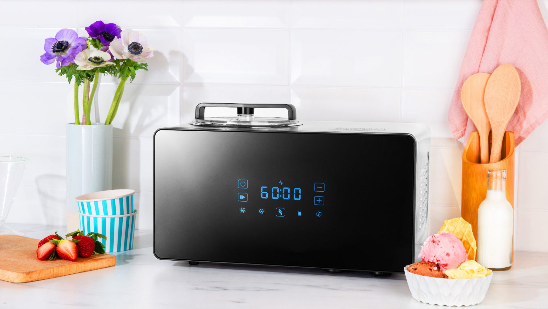 Die Eismaschine produziert bis zu 1,5 Liter Speiseeis in der Stunde. Das Joghurt-Programm liefert cremigen Naturjoghurt oder Frozen Yoghurt