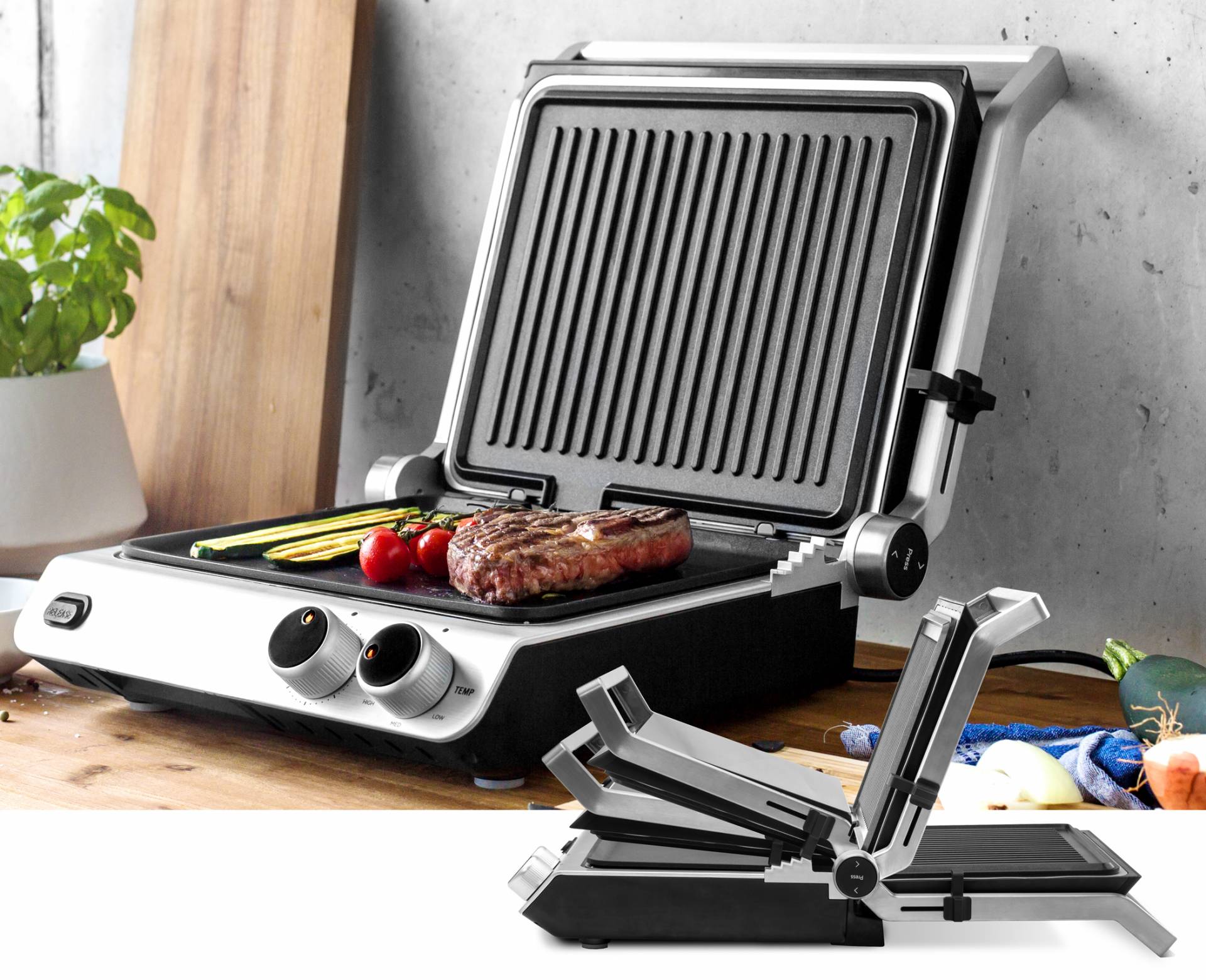 Aufgeklappt ist der Grill auch als großer BBQ-Grill nutzbar. Die untere Grillplatte ist glatt, so dass auch Pfannkuchen und Spiegeleier darauf gegart werden können. Die Grillplatten sind herausnehmbar und spülmaschinengeeignet.
